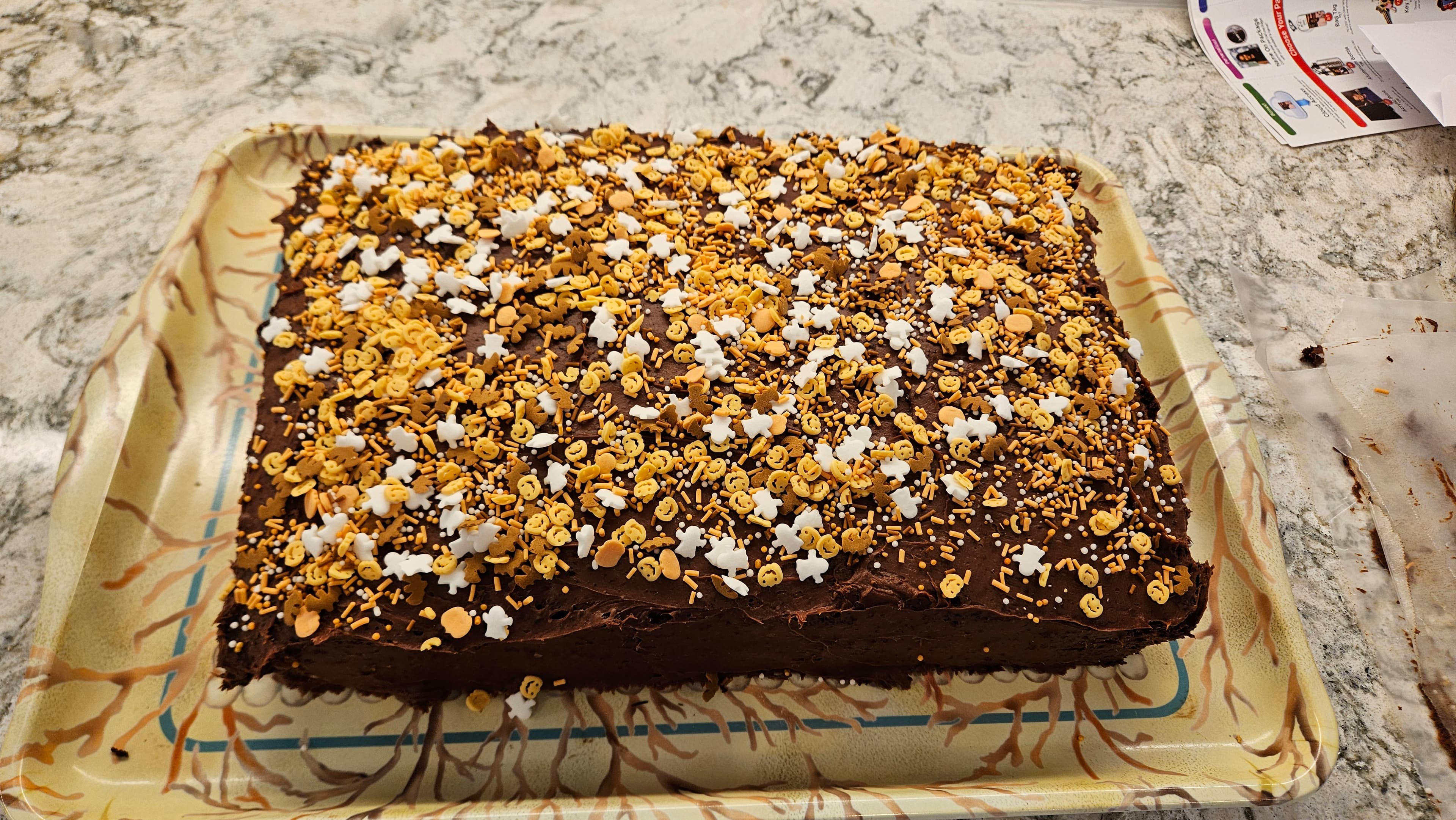 Well, it didn’t come out too pretty, but it sure tastes good. I will absolutely double the frosting next time - one batch is nowhere near enough. (I wonder if I doubled it last time since I don’t remember such a skimpy amount of frosting.) One of my layers started completely crumbling as I was icing it and I didn’t have enough frosting to patch it so I tried to cover it with some