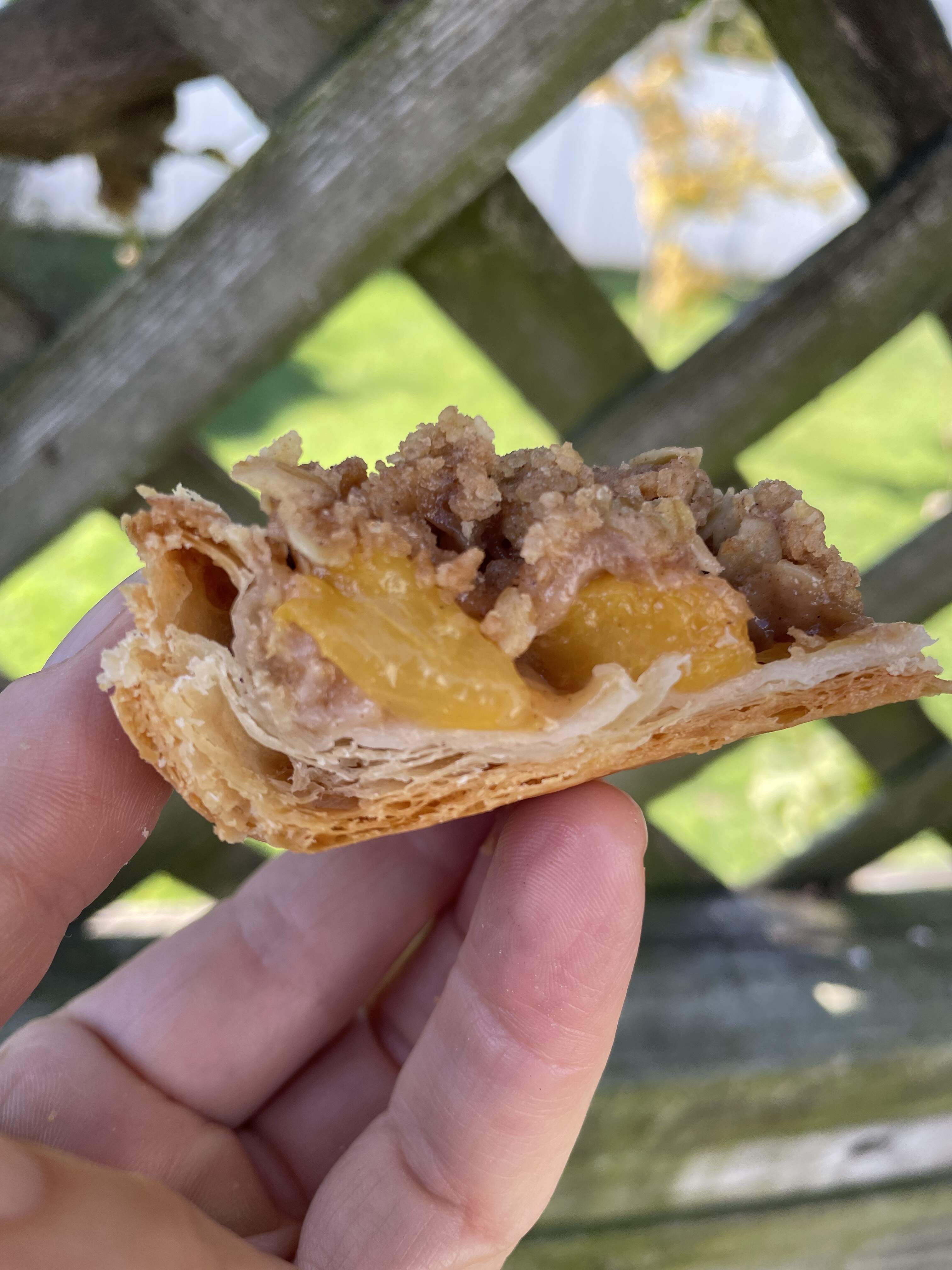 - Assemble pie: bottom crust, single layer of peaches, thick layer of streusel.