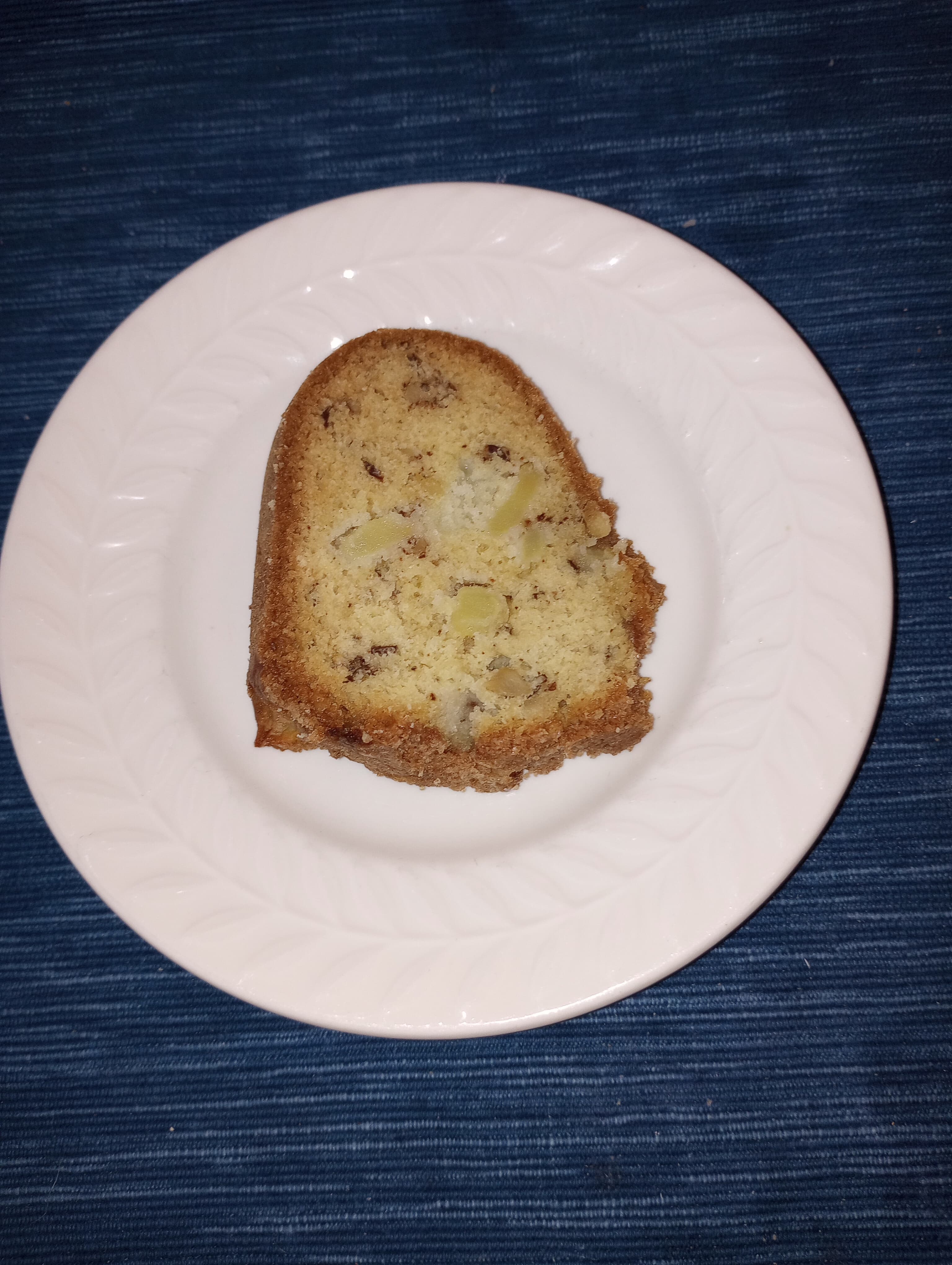 Fresh apple cake in a half-size Bundt pan, featuring diced apples and walnuts. A simple cinnamon/flour/sugar/butter struesel, spread evenly on top before baking, adheres well when cake is tipped out and “top” becomes bottom. The recipe is from an old community cookbook. Nice that these “moms of classmates” that I knew growing up live on through their shared recipes.