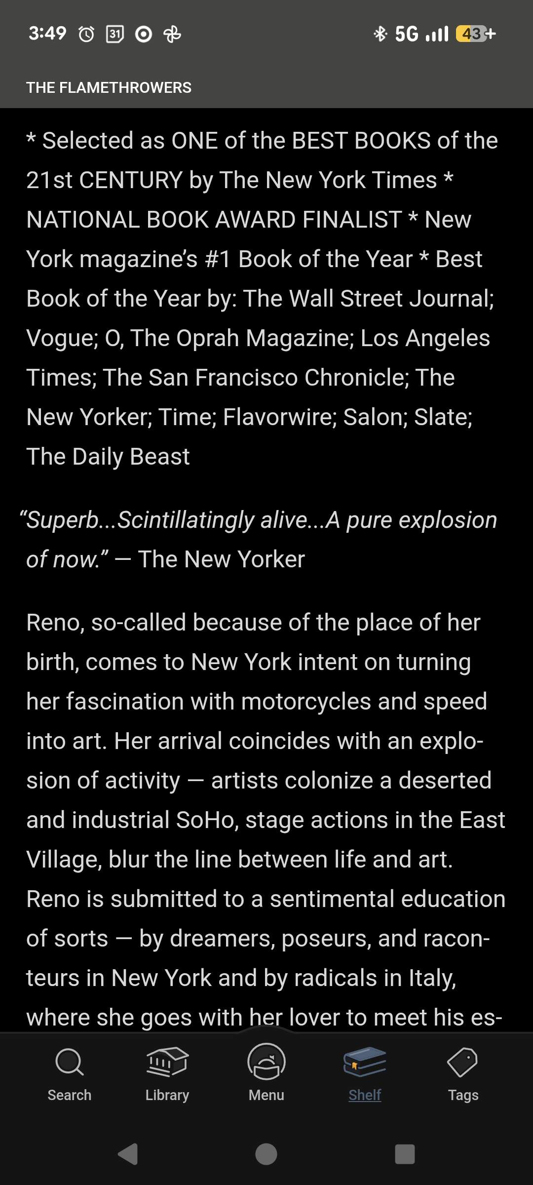 I just finished and greatly enjoyed Forbidden Notebook by Alba de Céspedes (similar themes and time period as Elene Ferrante postwar novels) and am now starting The Flame Throwers by Rachel Kushner.