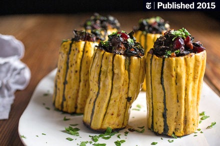 I find most squash (zucchini and yellow squash aside) and pumpkin to be on the sweeter side of the flavor spectrum, so I tend to go with savory fillings — think ground beef or lamb or pork, or chopped up & sautéed mushrooms and breadcrumbs. A little feta or ricotta salata might also be a nice addition.