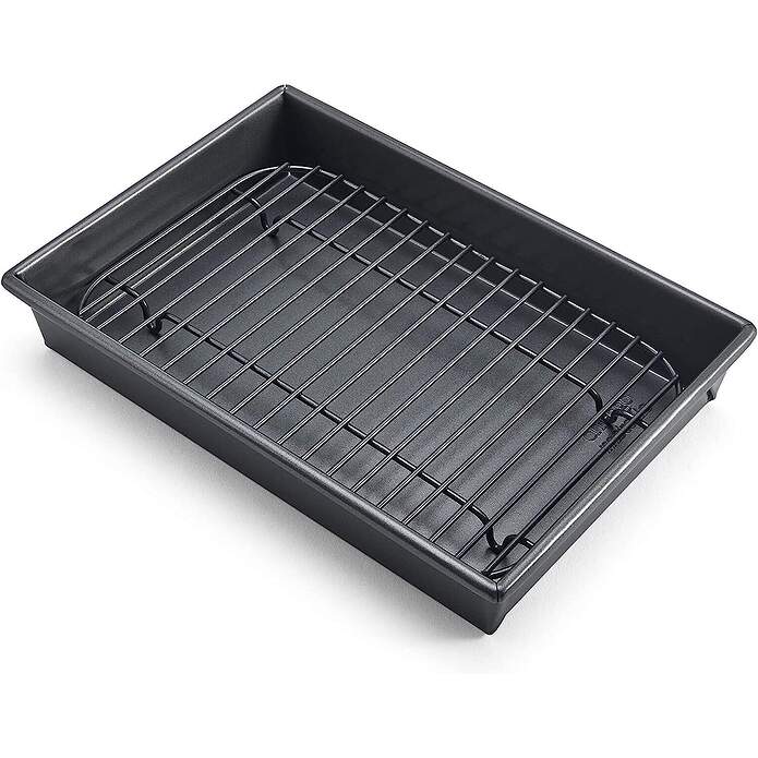 I bought a new oval roasting rack, and a new mini rectangular roasting pan with its own rack about 3 weeks ago at a cute kitchen shop 60 miles from home. I didn’t realize until I washed the roasting pan that they are all coated in non-stick coating. I don’t use any non-stick skillets and my only non stick pan was a wok that my roommate destroyed with a fork in 1993.