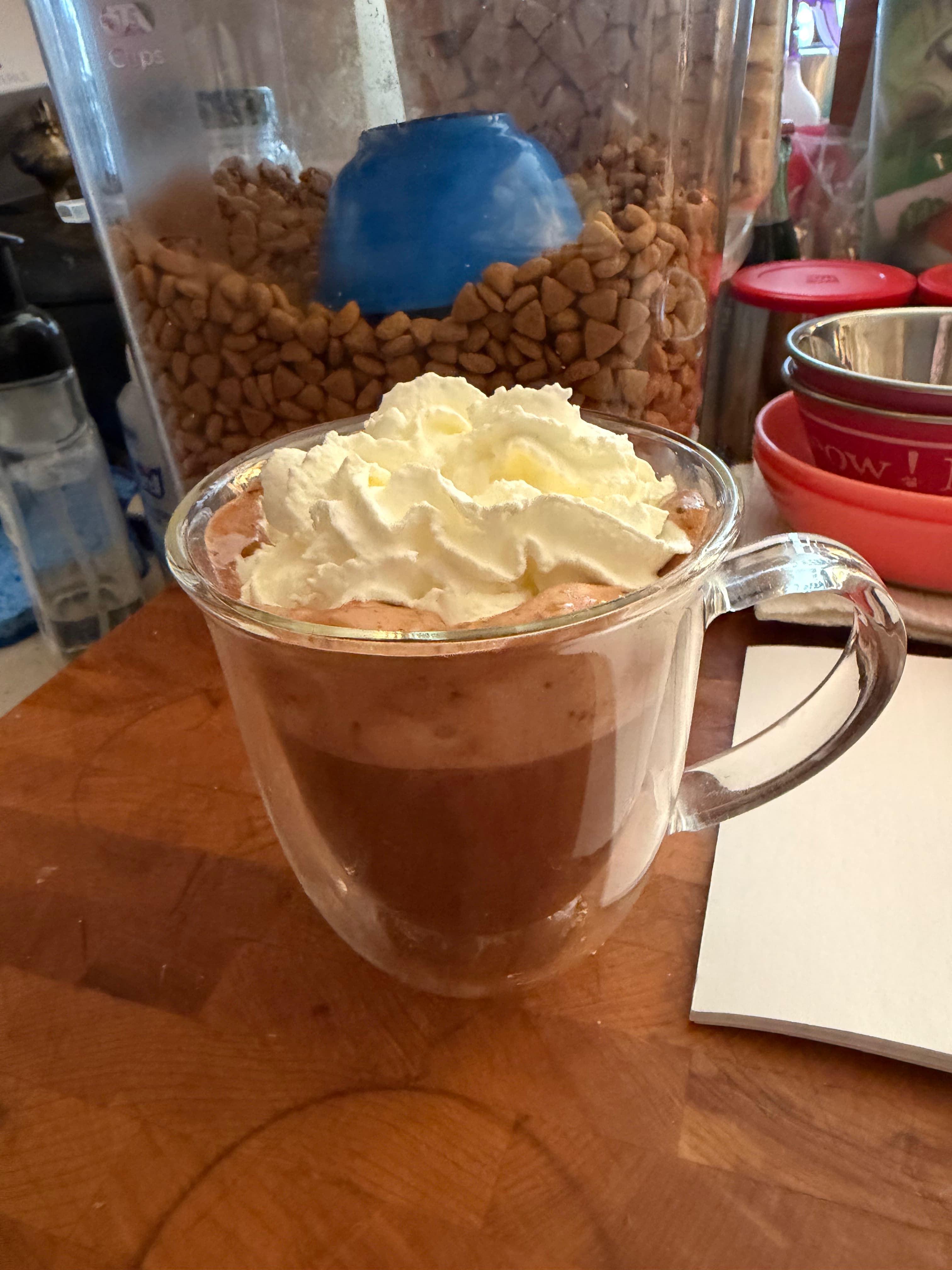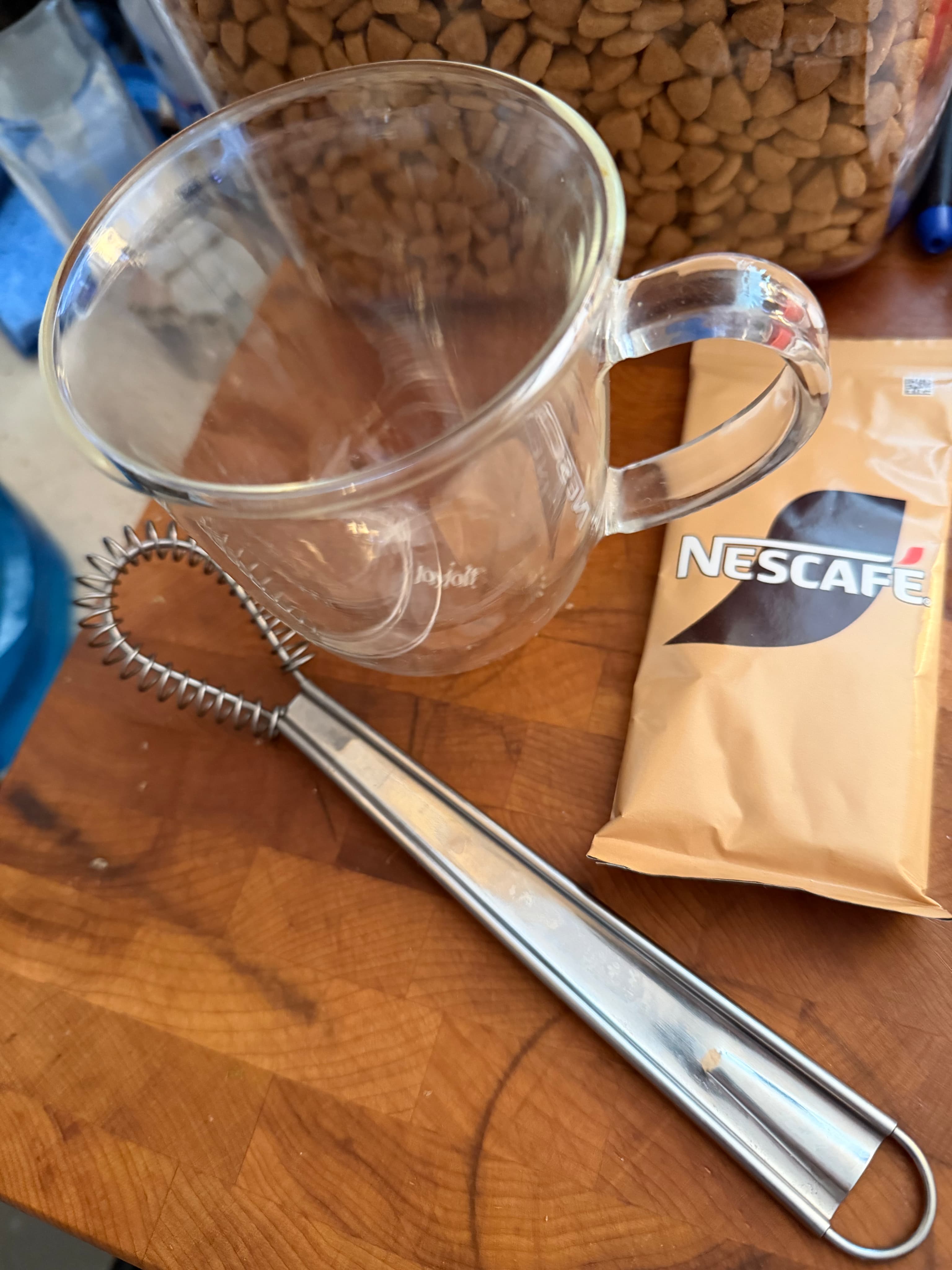Nestle’s instant Mocha. Canned whipped cream. Little D whisk. I wanted a lazy cup of something sweet. The whisk frothed up the liquid - no icky lumps. As penance, I’ve just bought real cream for my ISO whipper. And this is the week I will unearth my new but unused espresso machine. Maybe.