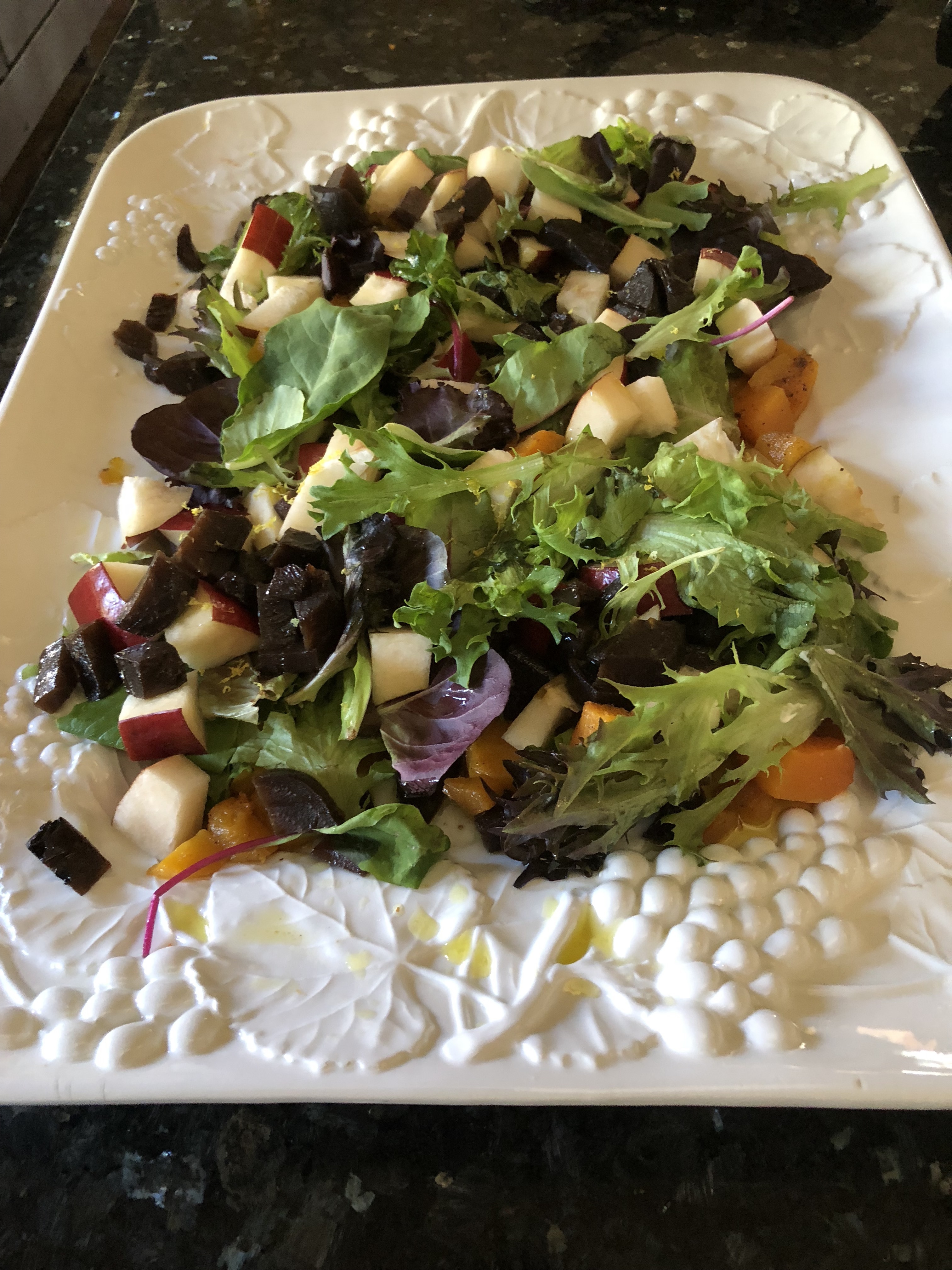 Had already prepared a salad of roasted butternut squash with EVOO, S/P and added 4 organic cooked beets , a red pear, and some spring mix. Made a vinaigrette of lemon Meyer lemon infused EVOO, red wine vinegar , 2 kinds of mustards, lemon , S/P but spilled half of it. So, I just added some more of the EVOO and balsamic vinegar. This will be topped with Feta Chesse. Do not know if I have time to roast some nuts. The picture is before I added the feta . There are more spring mix in there, just hidden under the beets.