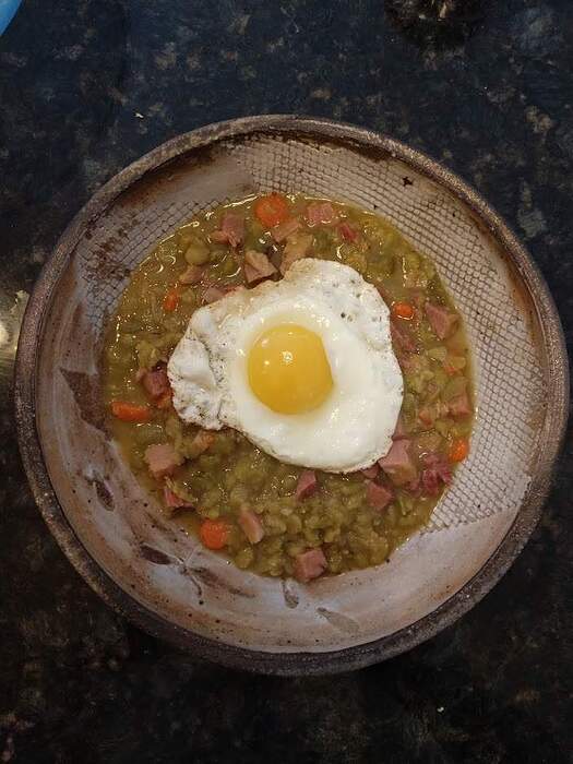 “Snow” day here in NJ. Ice/Rain seems more like it but they closed my daughter’s school so I had to take off work. She “helped” me make lunch. Split pea with ham and a fried egg. I’m thinking pizza for later… mmm