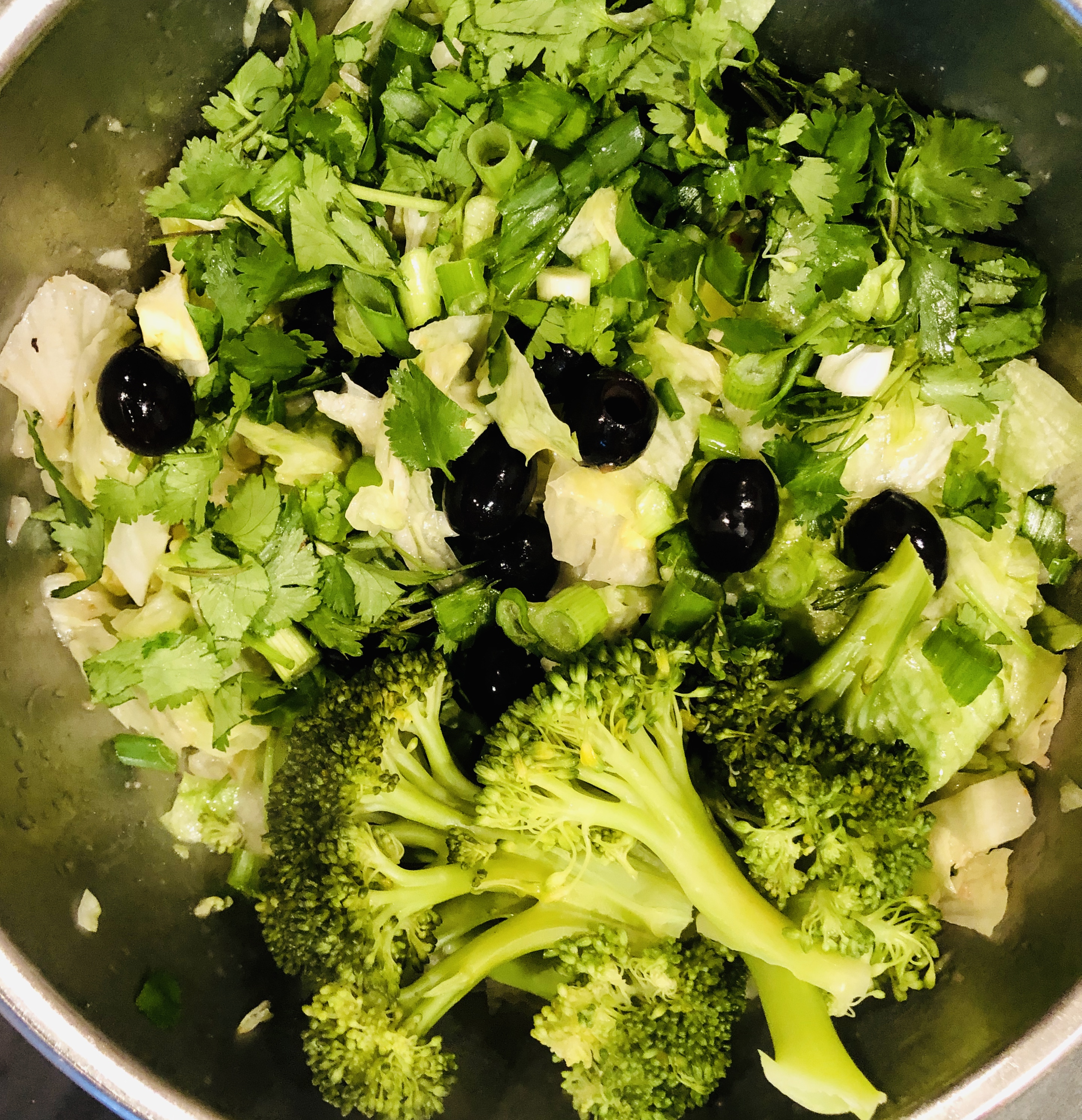 Very green salad with some broccoli leftover from lunch, a ton of cilantro, scallions, olives, same kimchi vinegrette and handful of those crunchy edamame