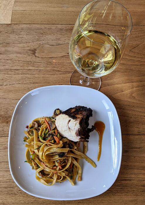 Tonight I made Thai-style sweet wokked noodles with carrots, scallions, zucchini, and mushrooms and gai yang (grilled cilantro-lemongrass chicken). It was good and the kiddo eventually dug in.