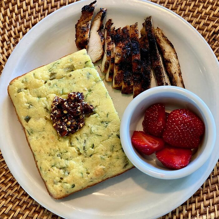 Australian egg slice (double serving). Leftover Cajun chicken strips. Fresh strawberries.