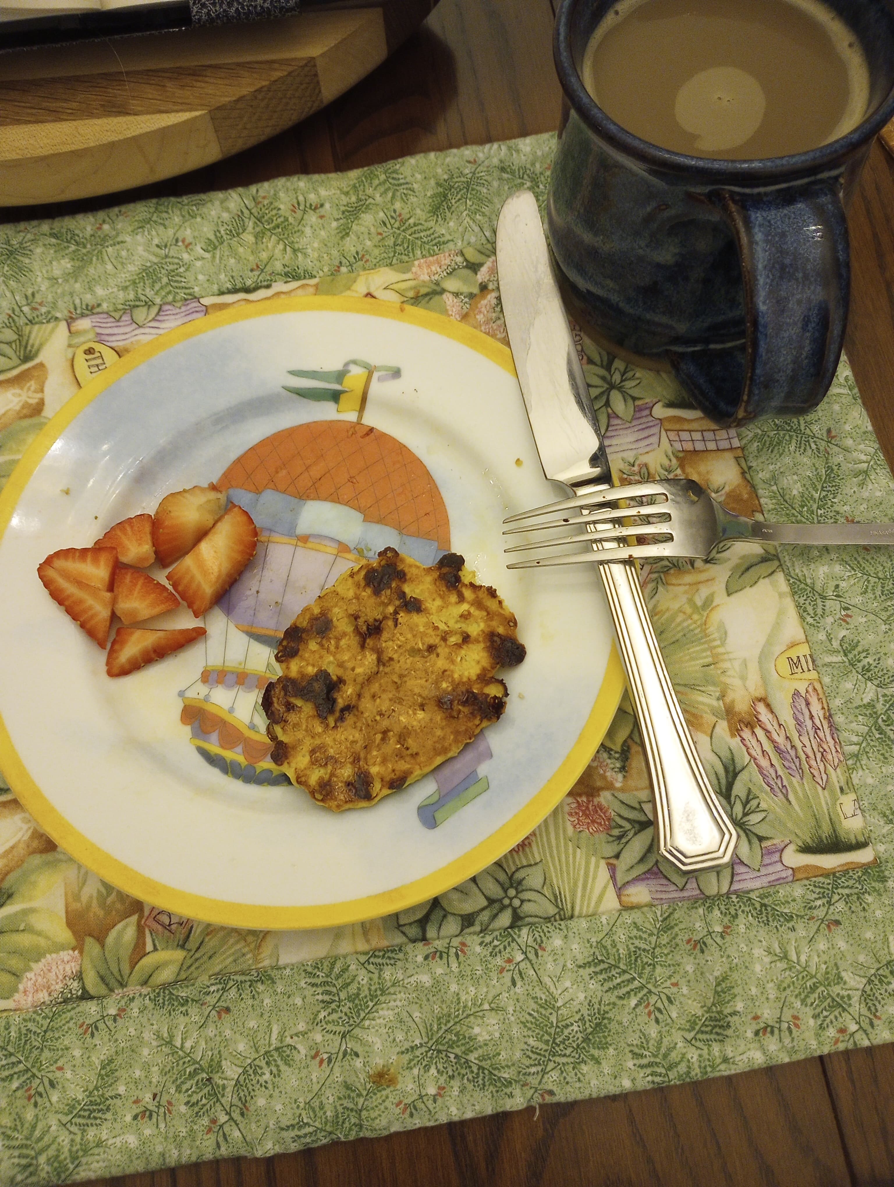 3-ingredient pancakes (blendered oatmeal, cottage cheese, egg with splash of vanilla, optional dash of cinnamon). I wrote about these in February with no photo since they were a mess in a regular skillet. Turns out the other problem in Feb was mis-remembering the recipe – 1/2 C cottage cheese. 1/2 C oatmeal needs TWO eggs to get the proper consistency. This batch was just fine – served with fresh strawberries and maple syrup. I paused to take a photo before devouring the last one.