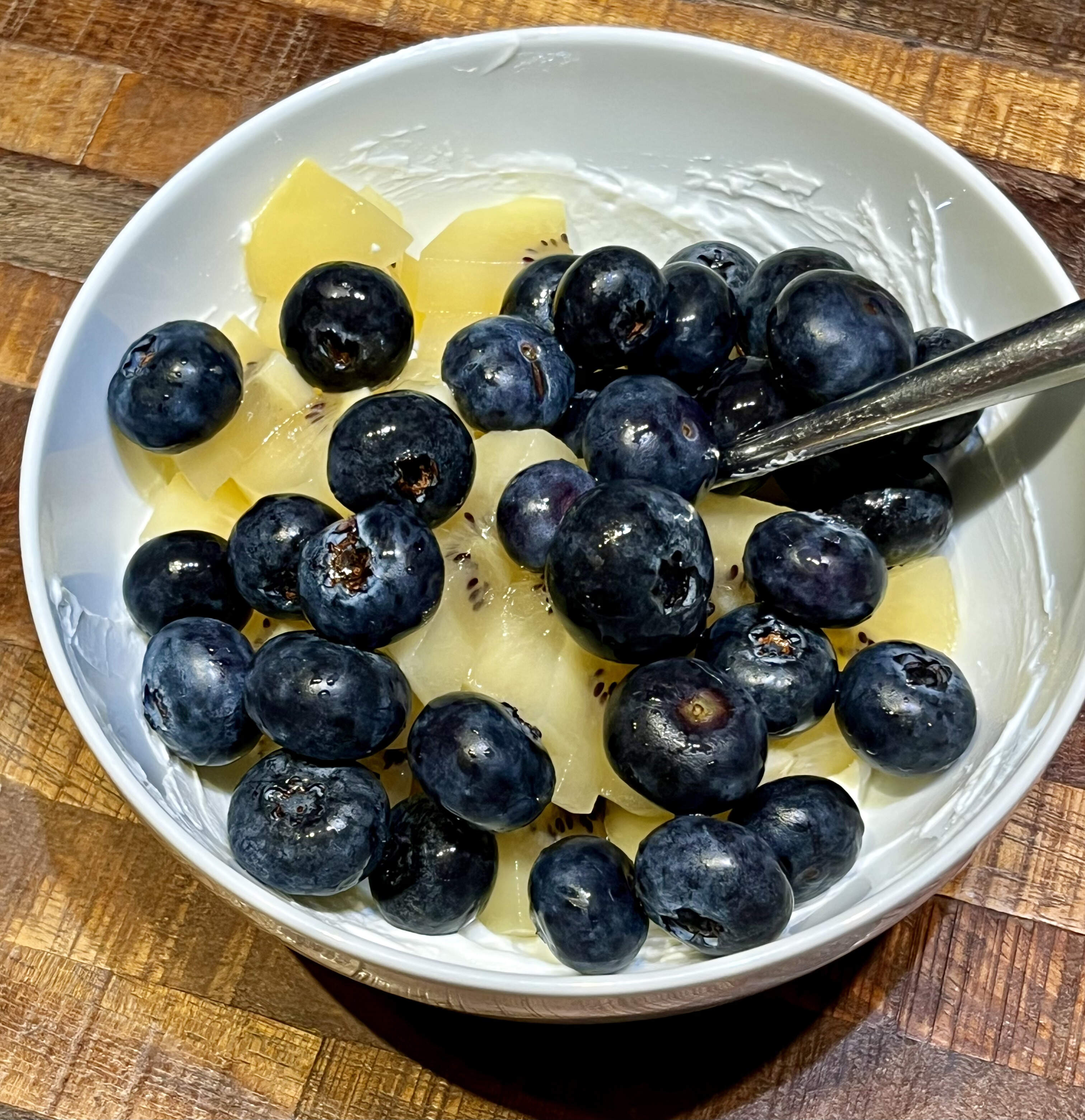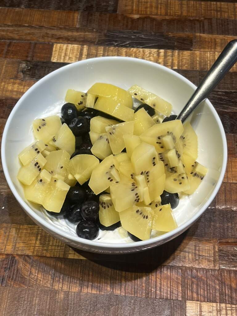 Another super-duper healthy bowl of Fage with delovely golden kiwi and pretty terrible booberries my dude raved over. Most of them were tart, some had a moldy off taste.