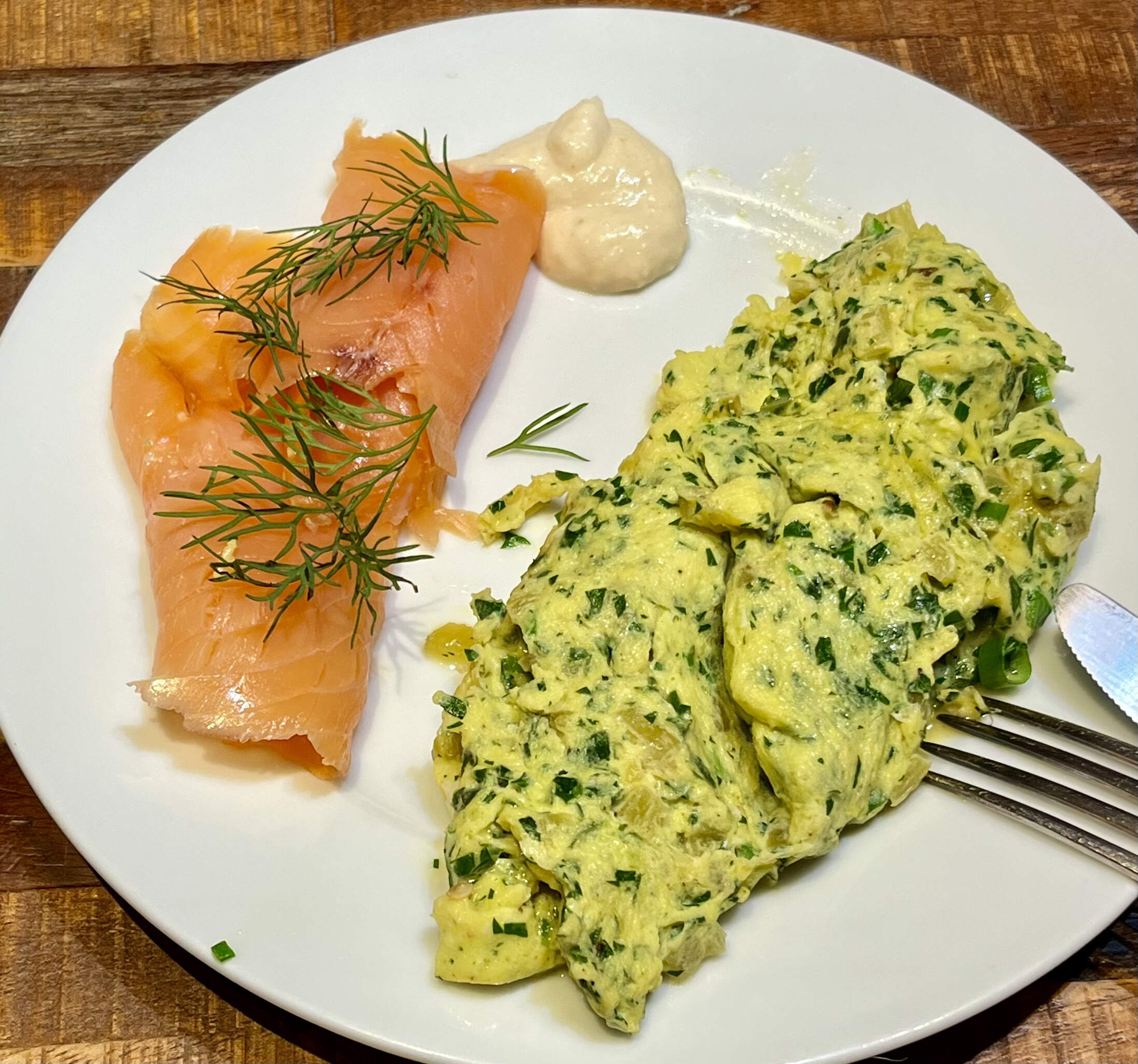 Verrry green scramblees with kitchen sill scallions & my friend’s garden parsley, plus a chopped roasted hatch chile. Smoked salmon & horseradish on the the side.