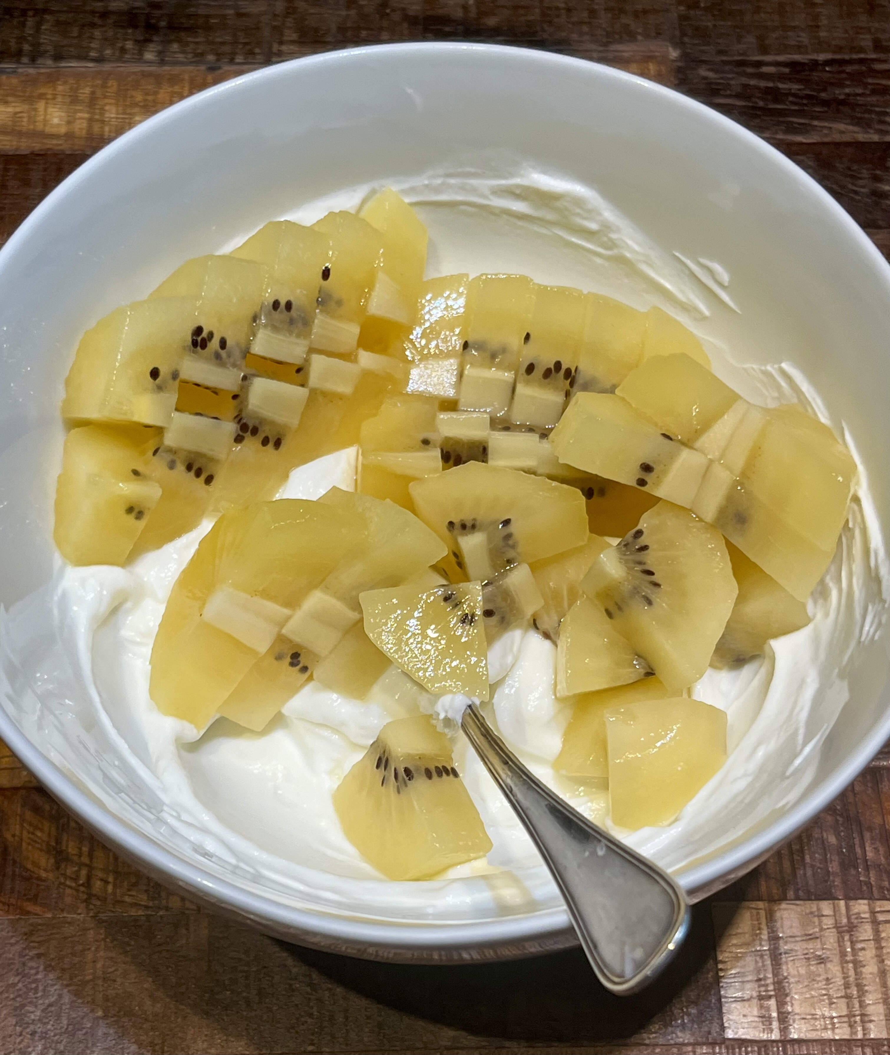 I made do with my usual bowl of Fage & sweet, juicy golden kiwi. In my jammies. And I won’t be sore tomorrow