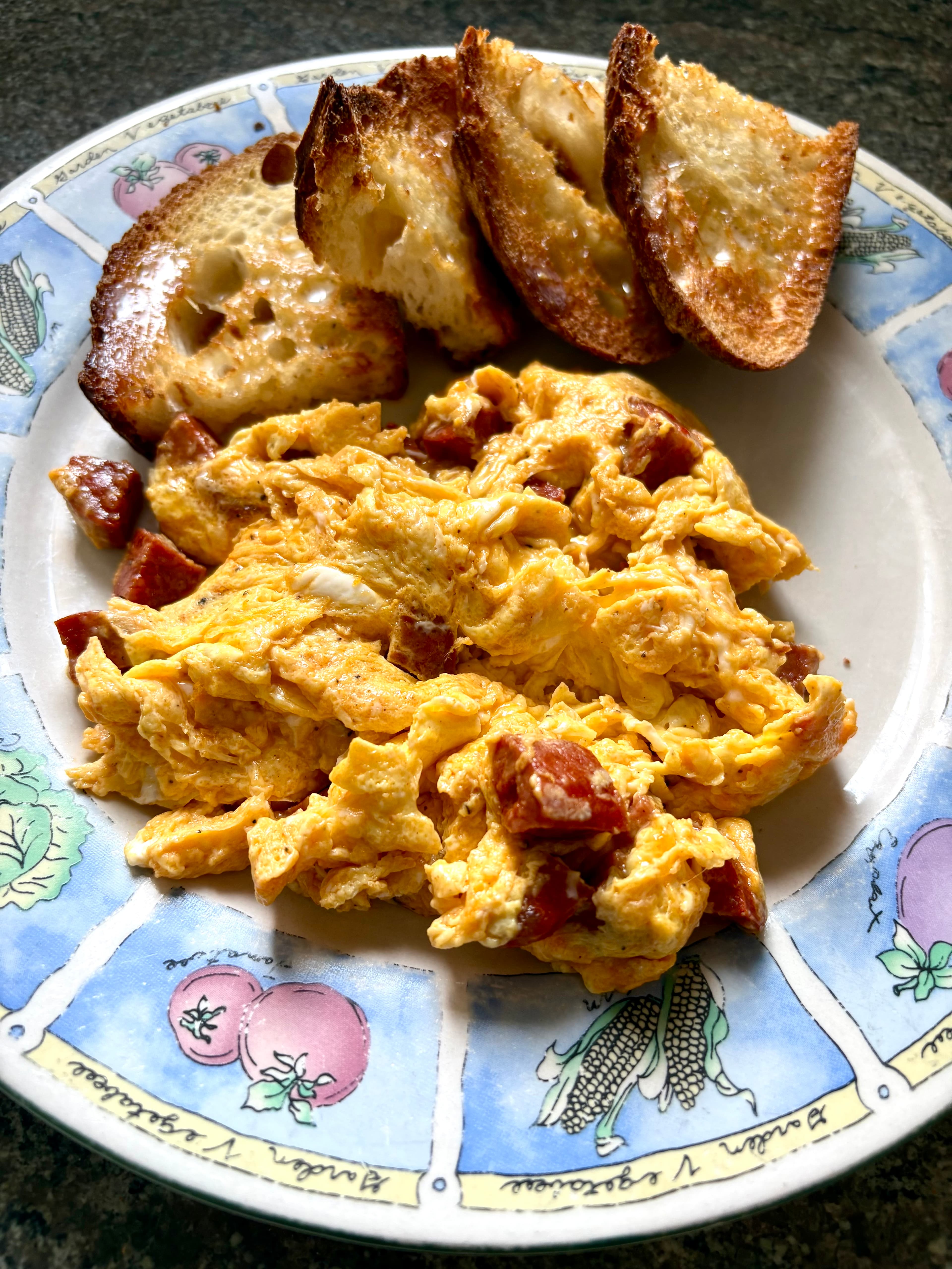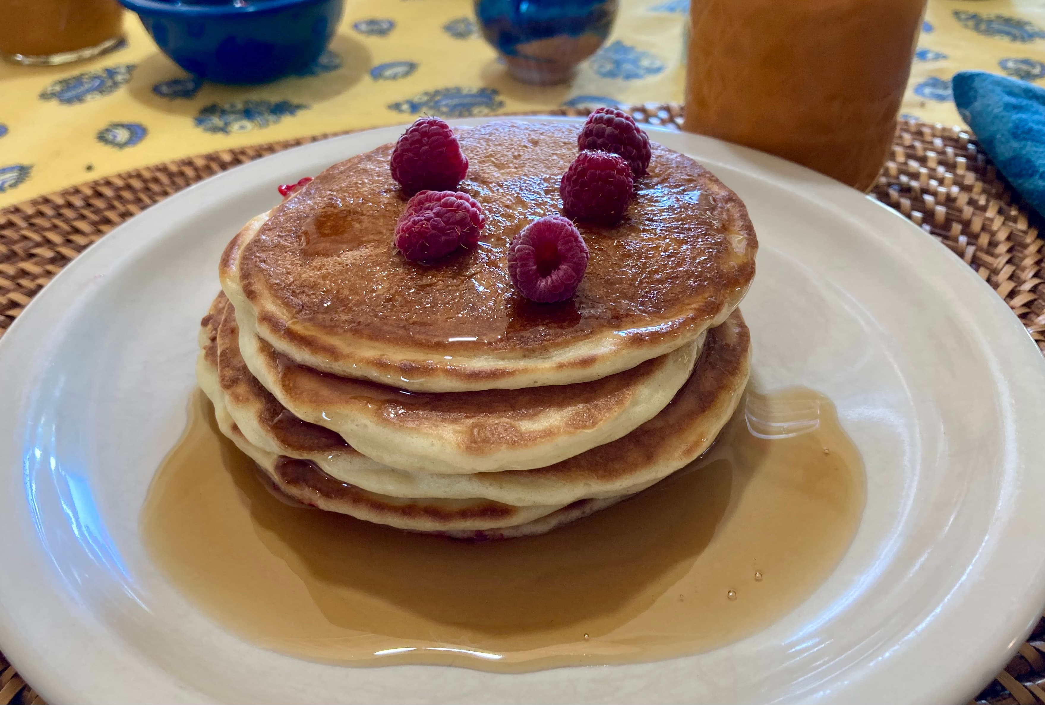 I pulled out 3 frozen sourdough discard pancakes and nuked them. Just butter on top. Good but a bit too sweet. Next time I’ll add less sugar.