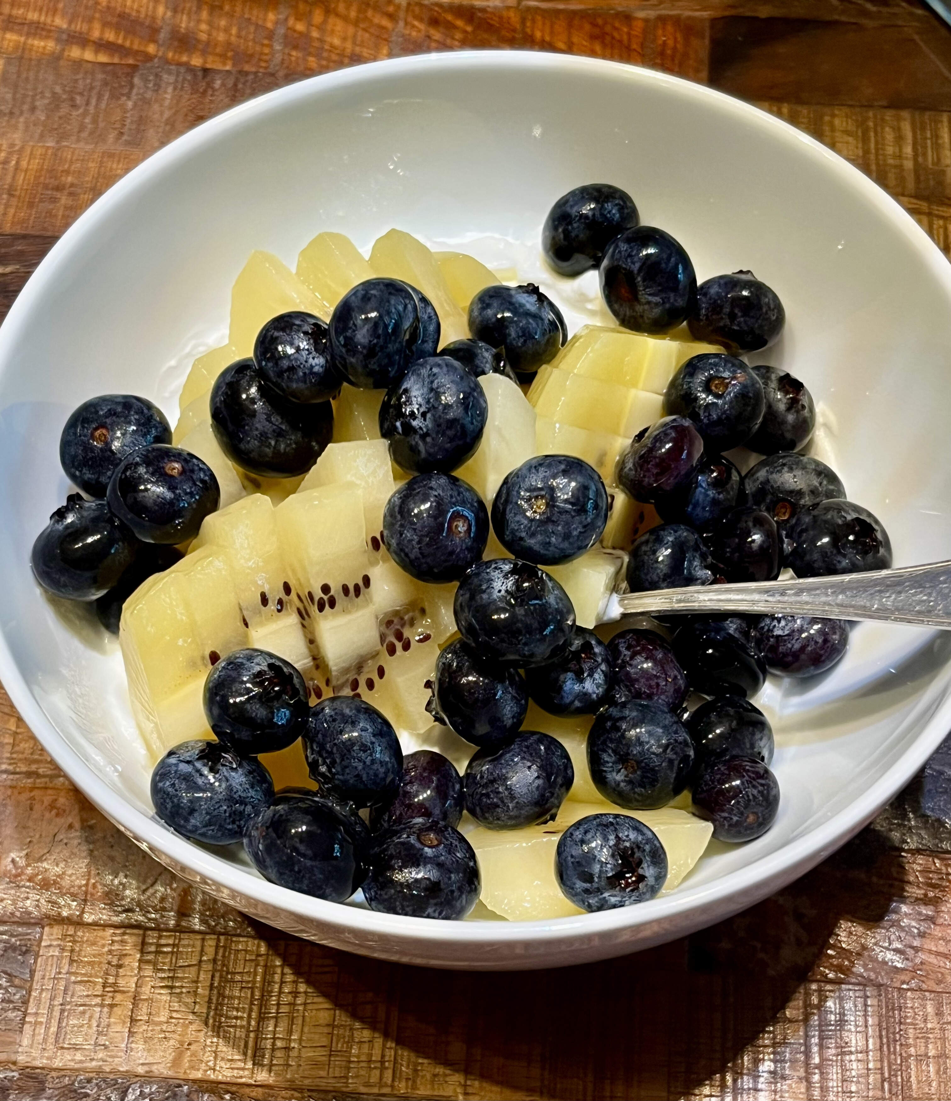 This morning’s breakfast is a fruit salad and a glass of milk. I’m having a light breakfast since I’m going for afternoon tea later.