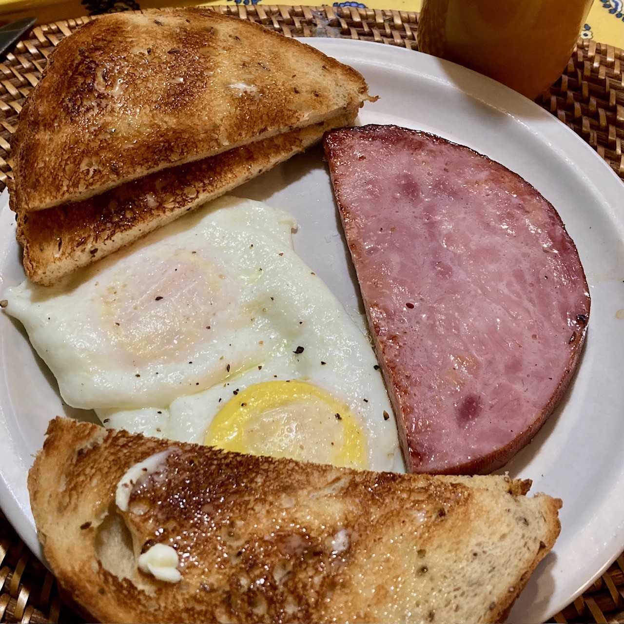 Toasted cheese bread topped with spinach dip today, an egg with peameal bacon and homemade hash browns yesterday.