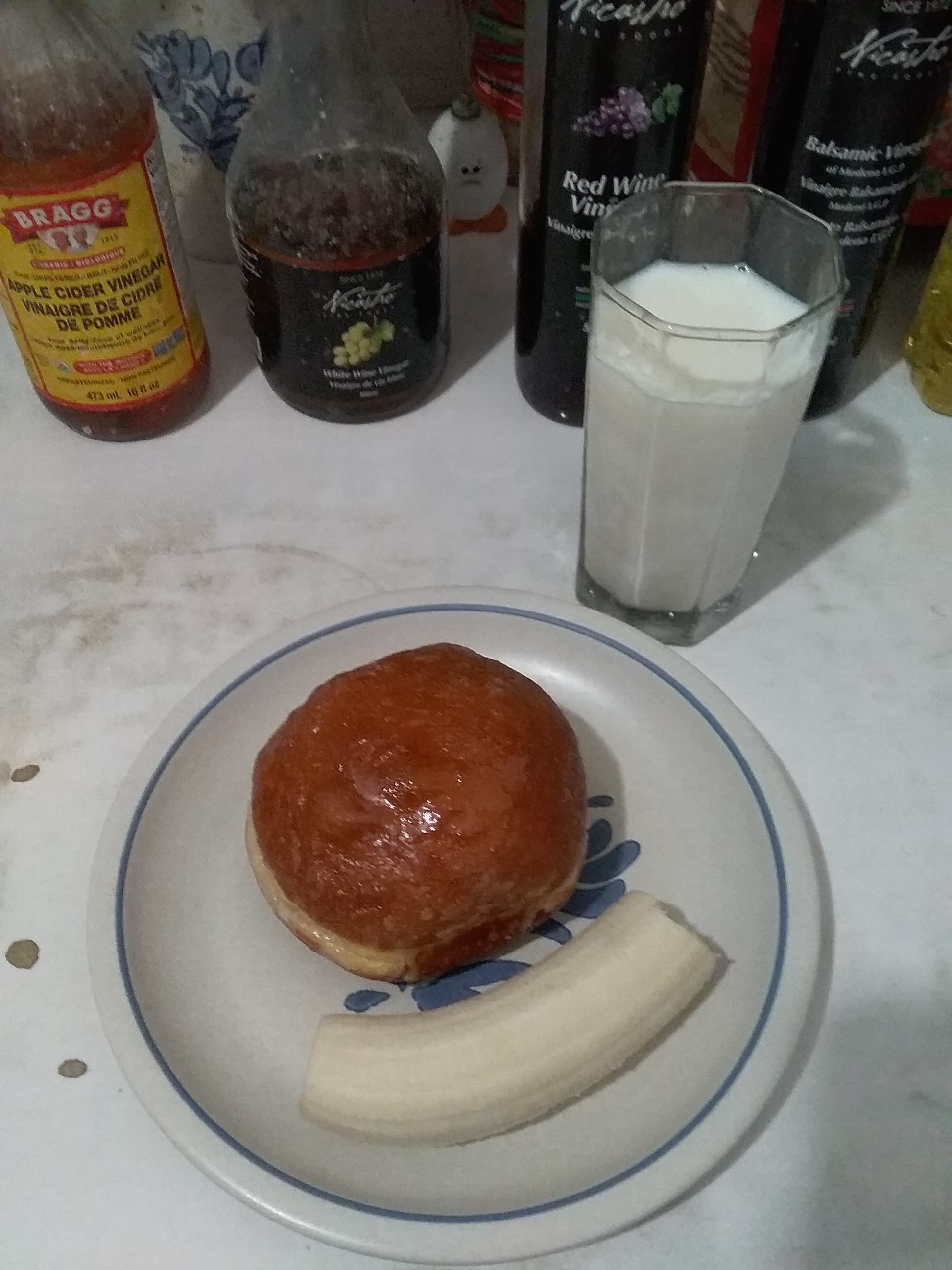 Rice cake and peanut butter and banana. I had intended on placing a whole banana at the bottom of the plate to make a happy face but the banana I reached for had a bruise so my breakfast has a crooked smile.