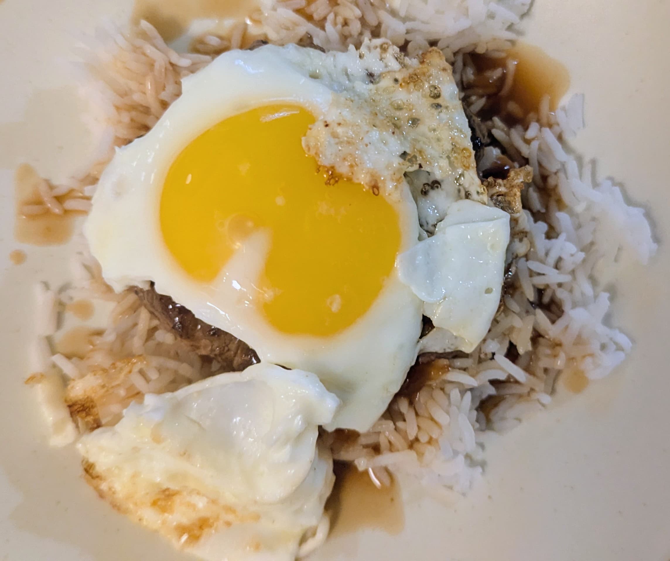 Loco Moco using leftover basmati and McCormick’s gravy, and a frappe iced coffee (Greek nescafe and milk)