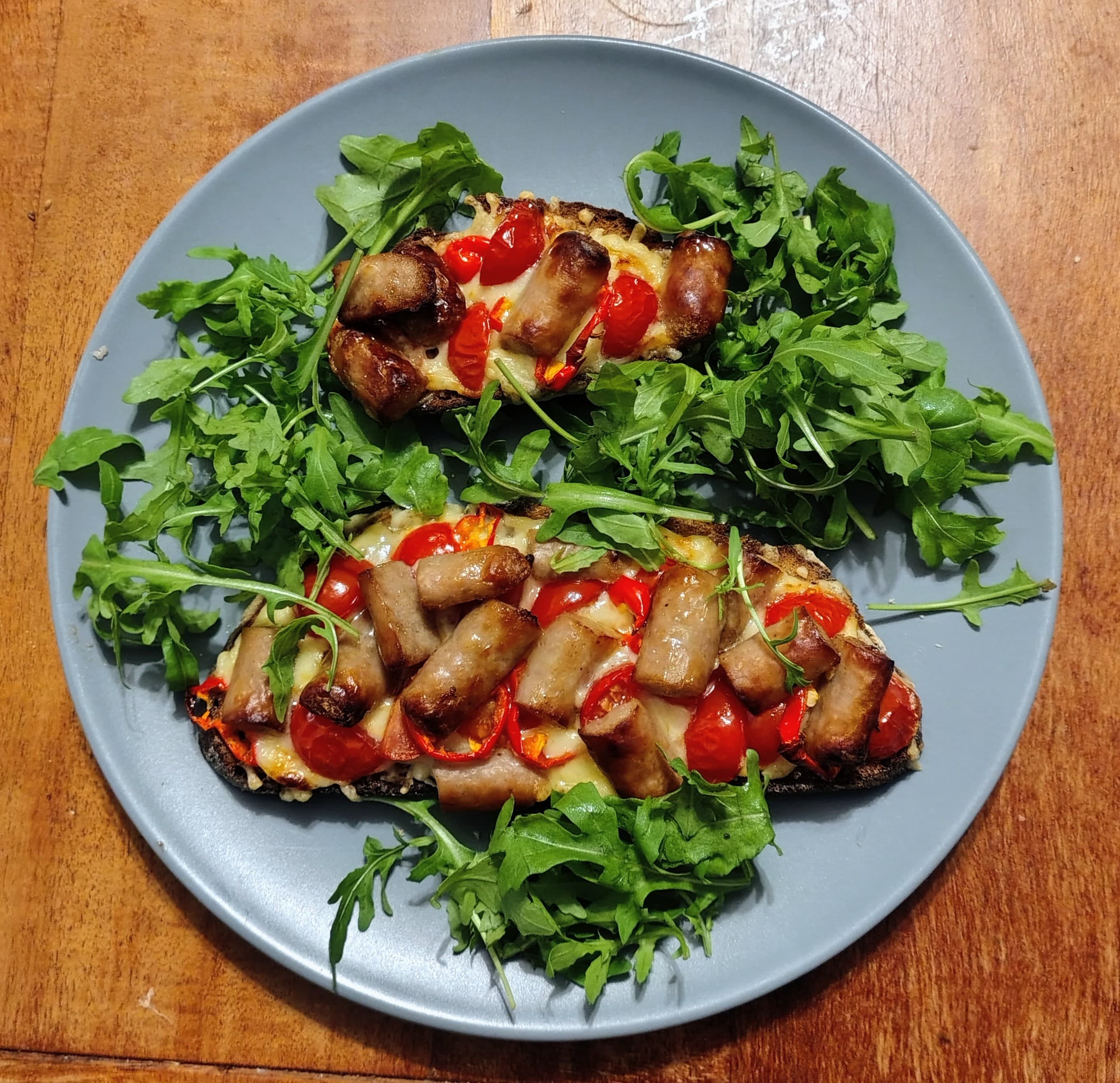 Breakfast ‘pizza’ made from rye sourdough bread, cheddar, cherry tomatoes, sliced red chillies, sausage, with lots of arugula to cut through the richness.