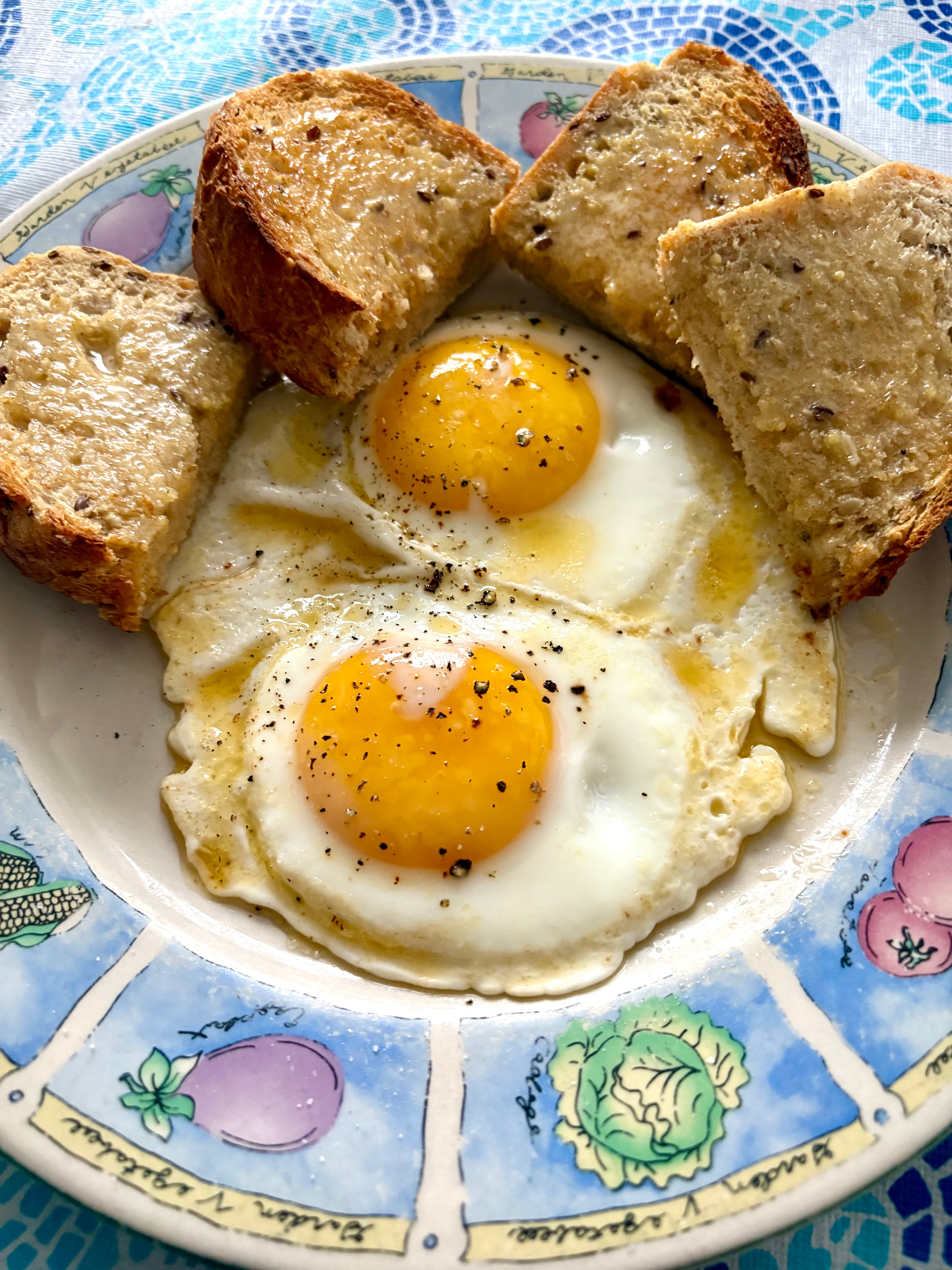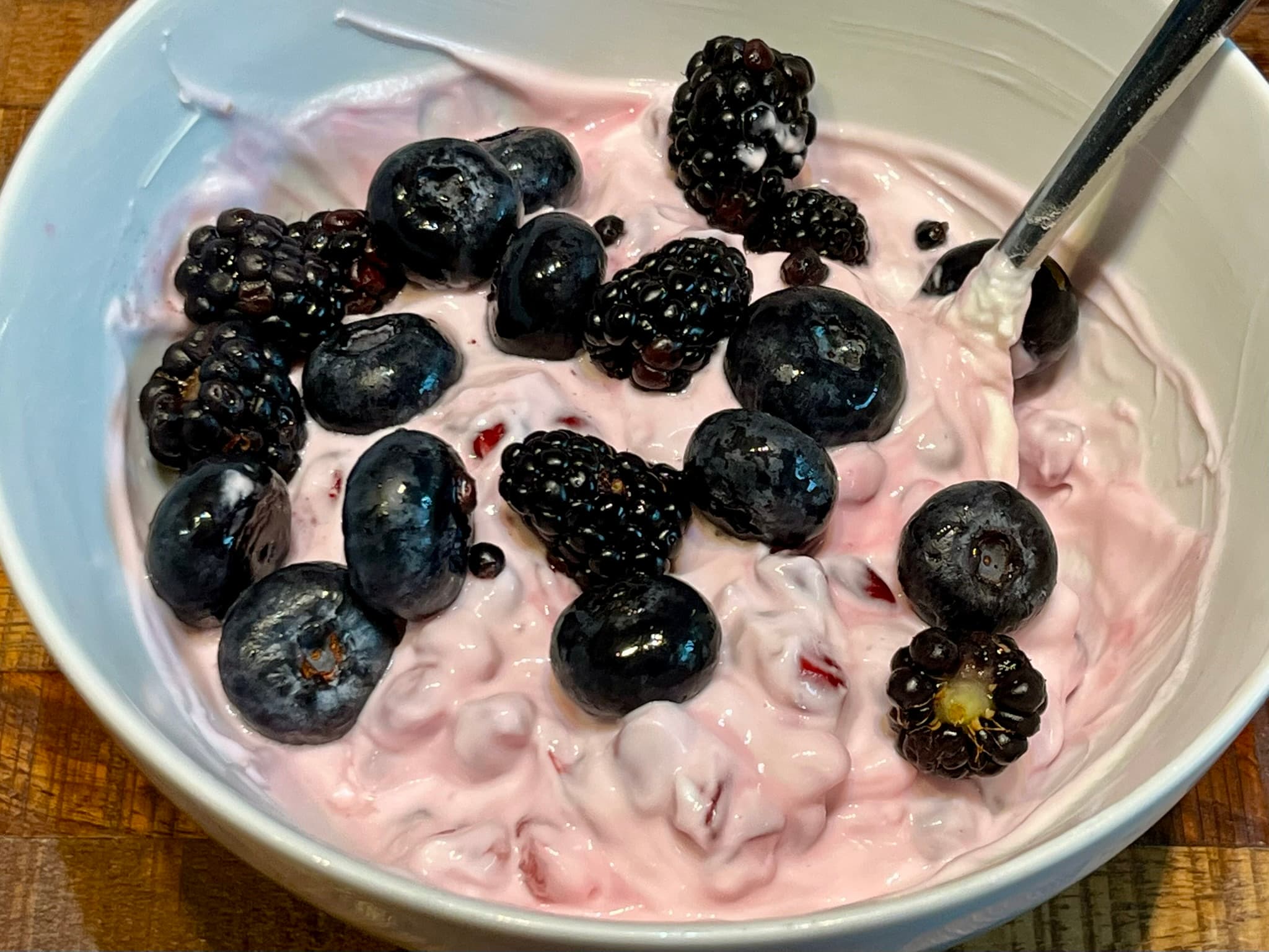 A sooper-dooper healthy virtuous late brekkie of Fage with about half a cup of smashed up poms & another half cup added as is, the few blackberries that hadn’t gone to shit yet, and a few booberries.