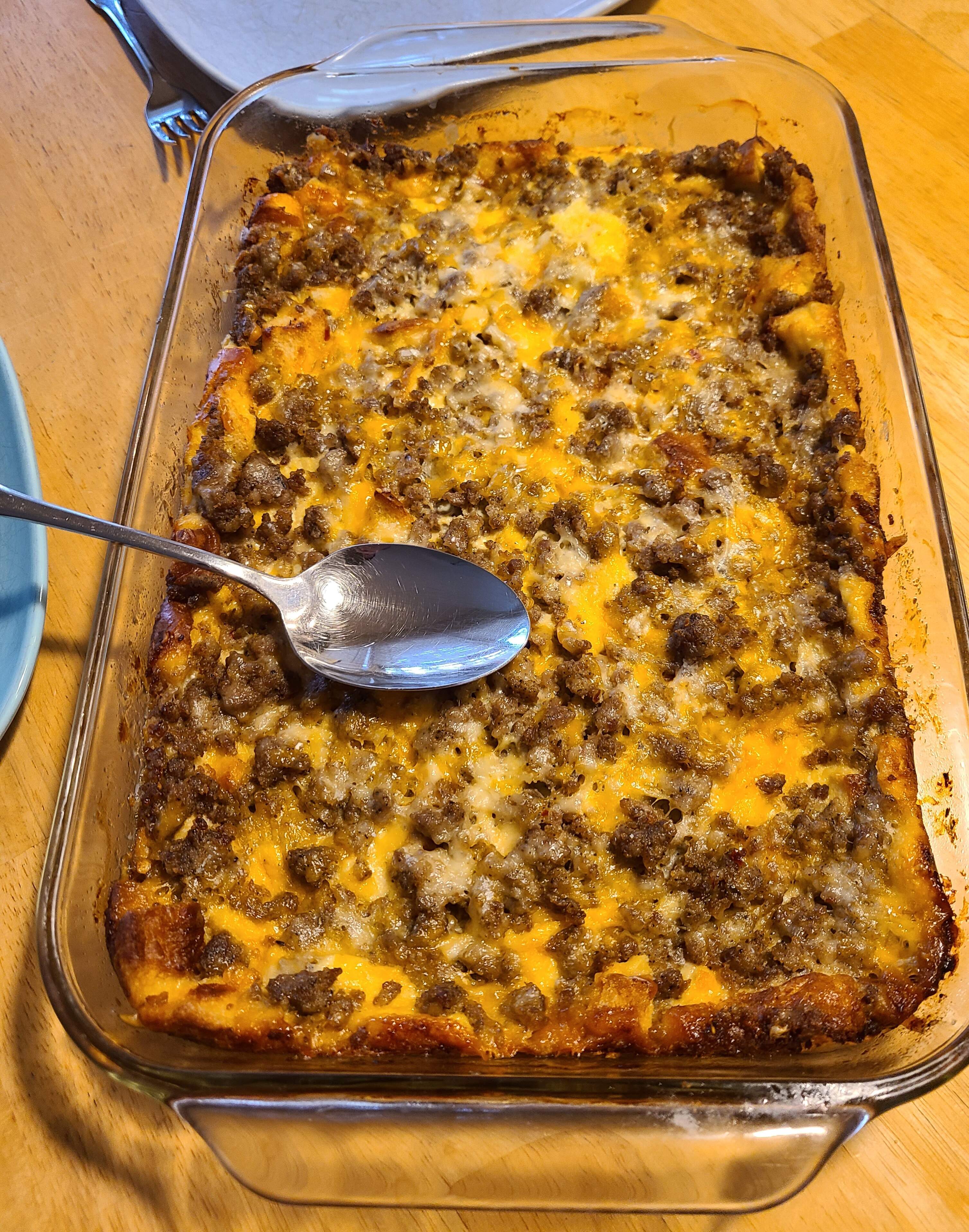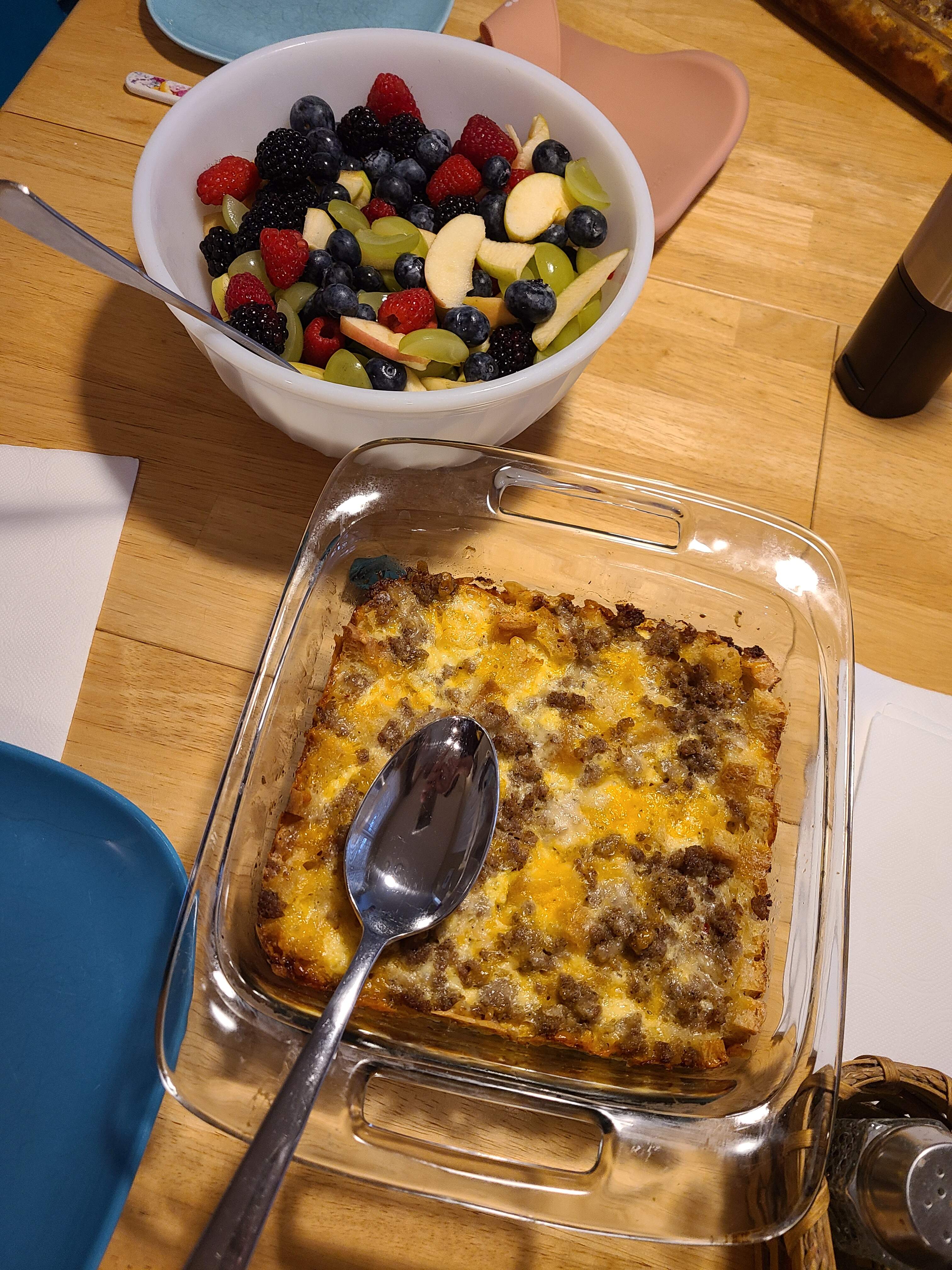 Christmas morning breakfast was fruit salad and GF and regular bread sausage egg cheese casseroles.