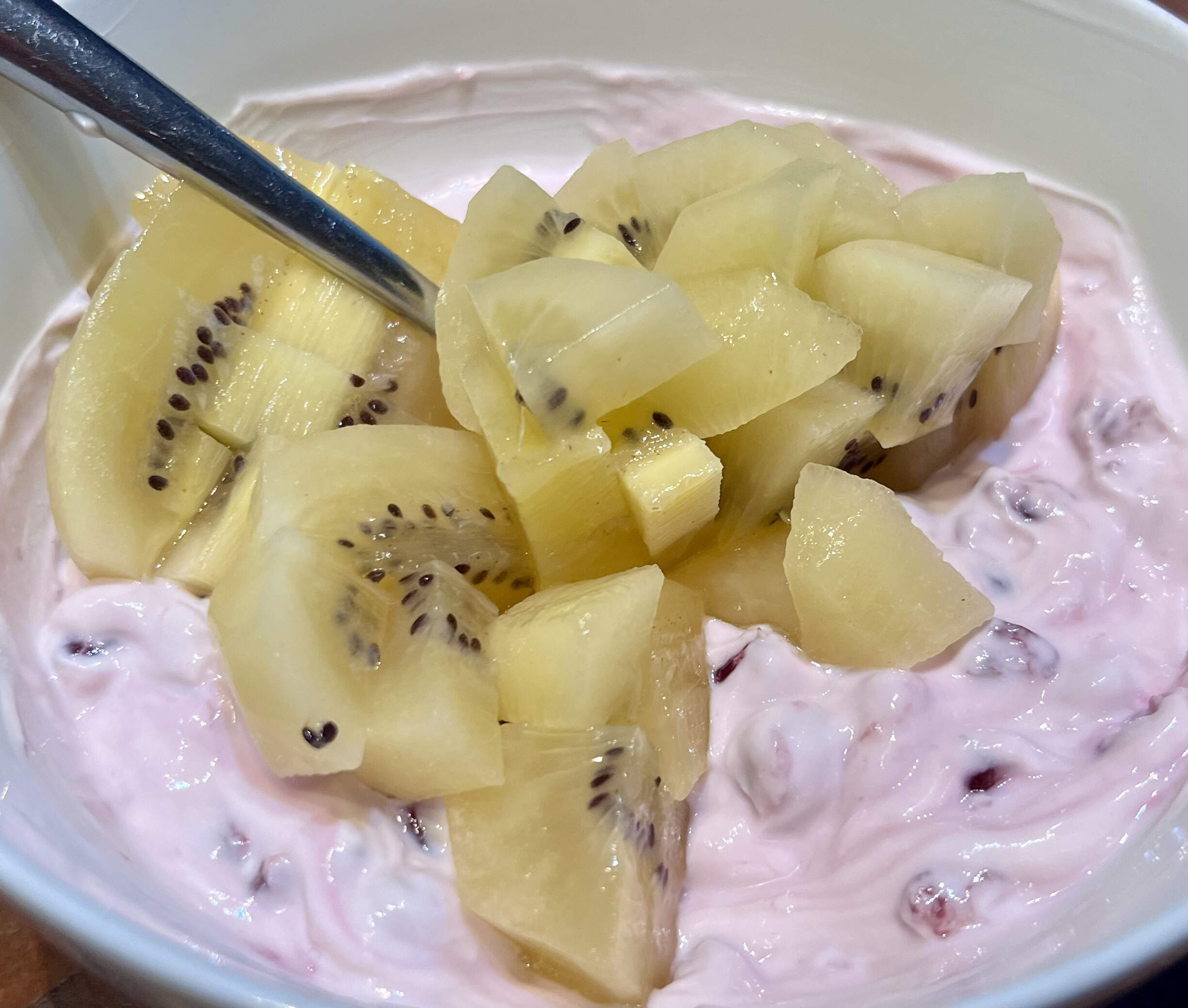 A very light breakfast in anticipation of the many seasonal eatings upon us: Fage, poms, kiwi.