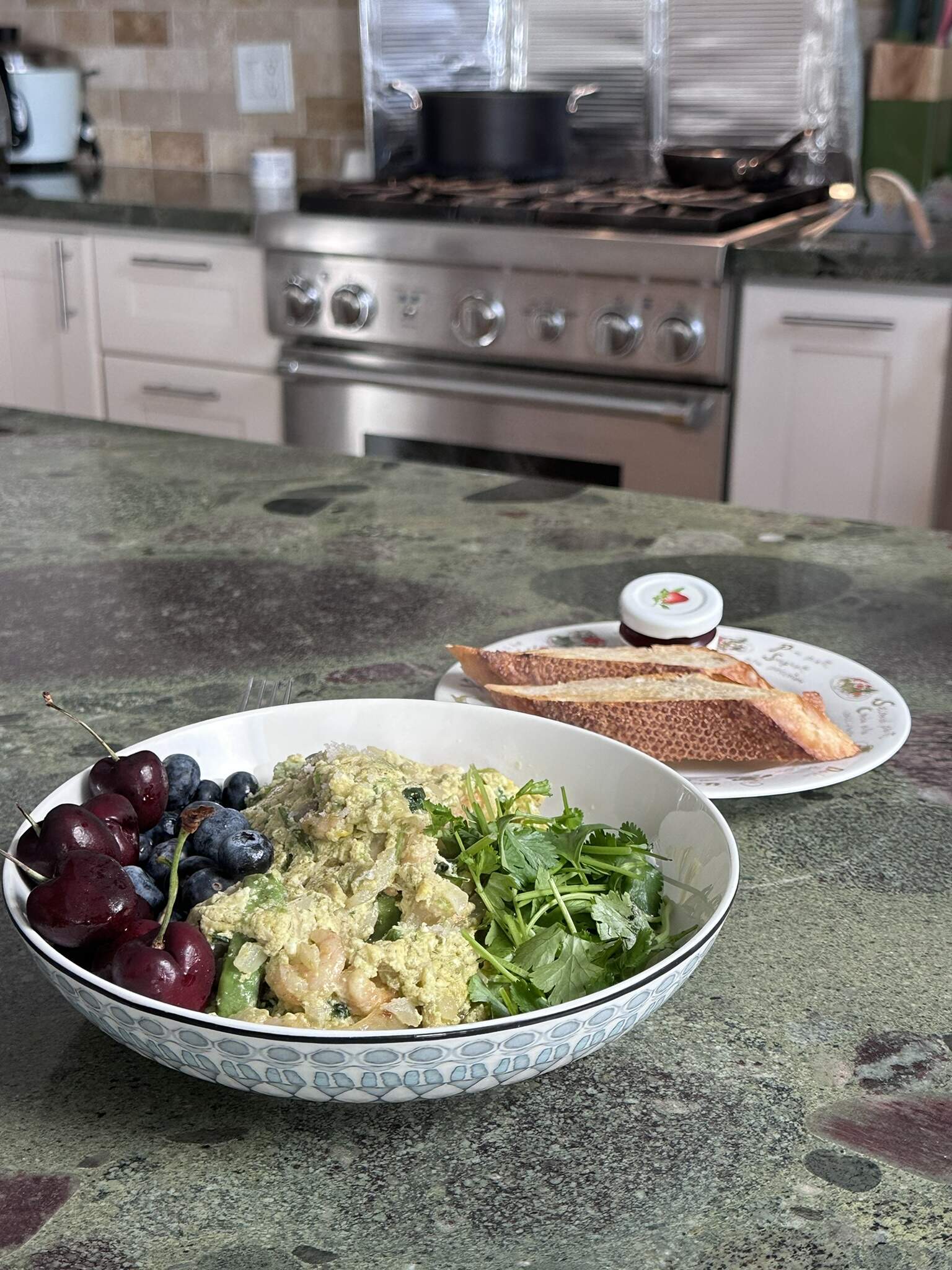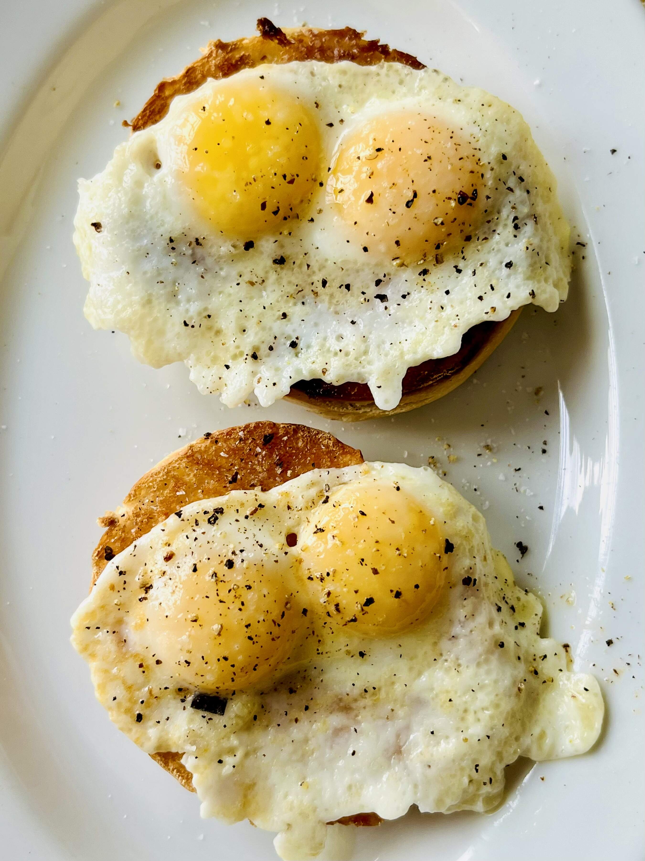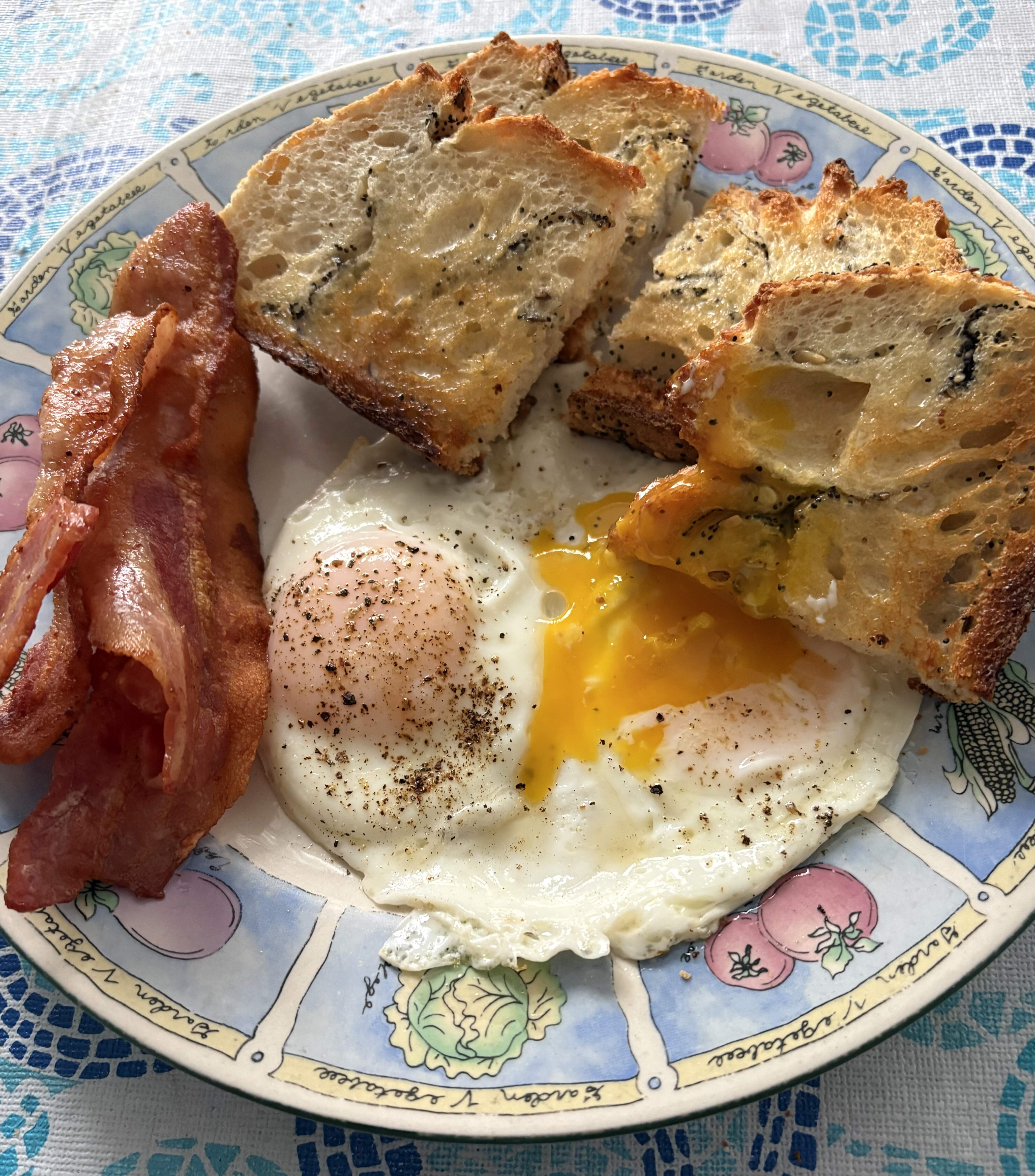 Toasted, buttered mini bagels and gently fried mini eggs..quail. Delicious, made them poached yesterday but fried are better!