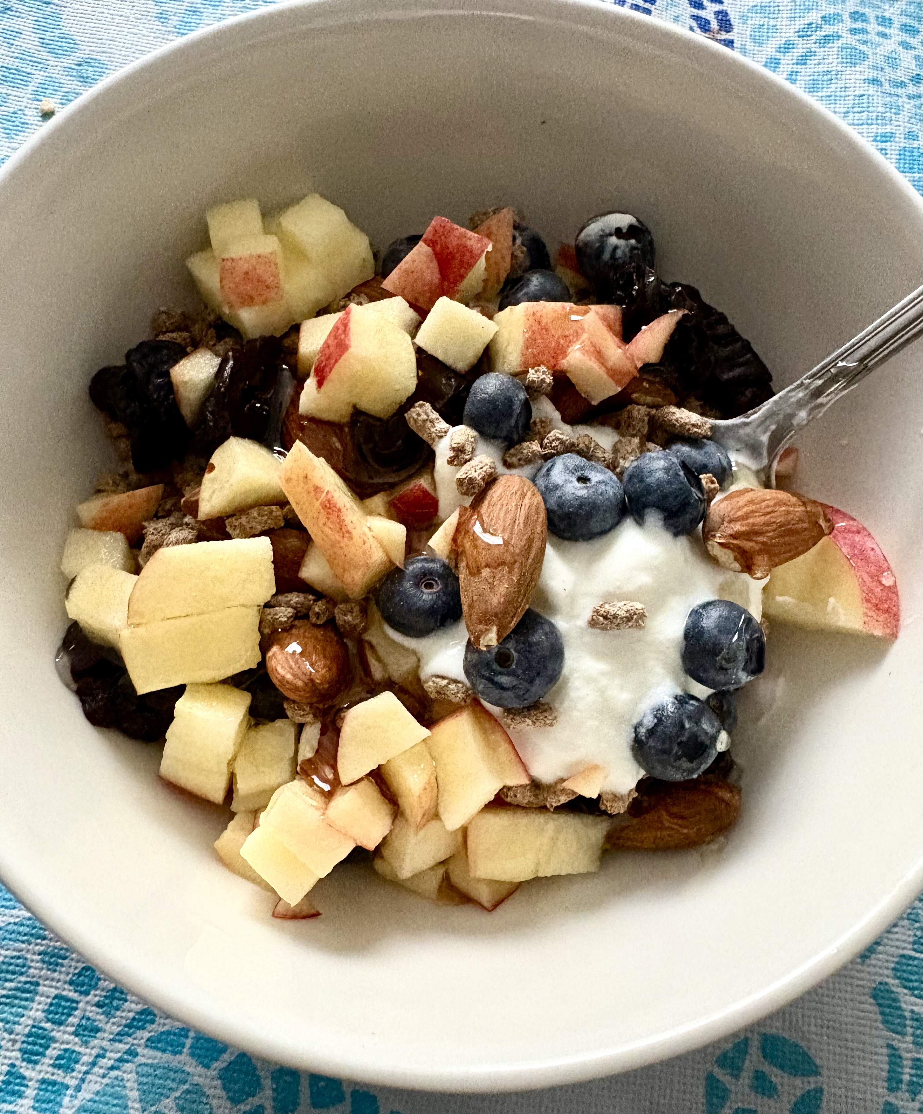 Plain(unflavored) Astro yogurt, almonds, diced apple, geezer buds, blueberries, dried prunes and honey aka, the usual..
