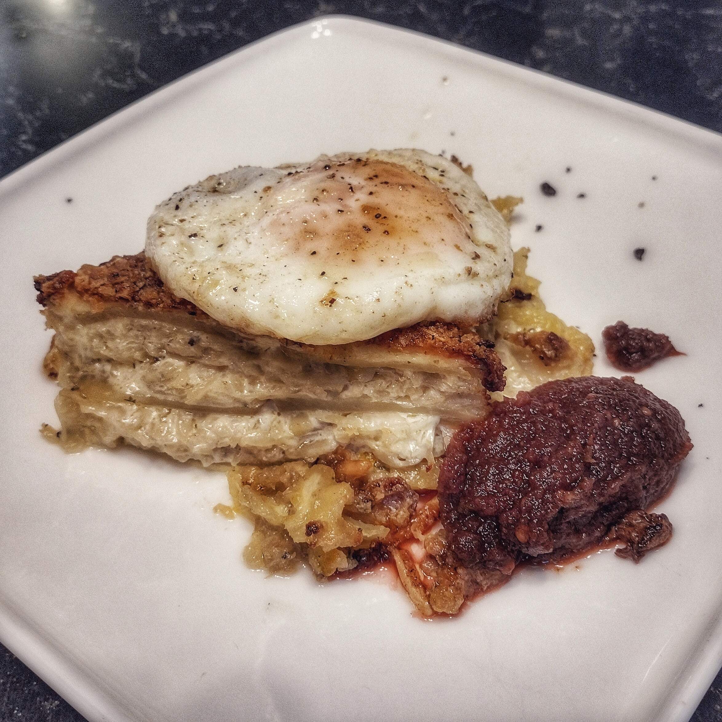 Cabbage and potato gratin leftovers, plus fried egg and beetroot compote.