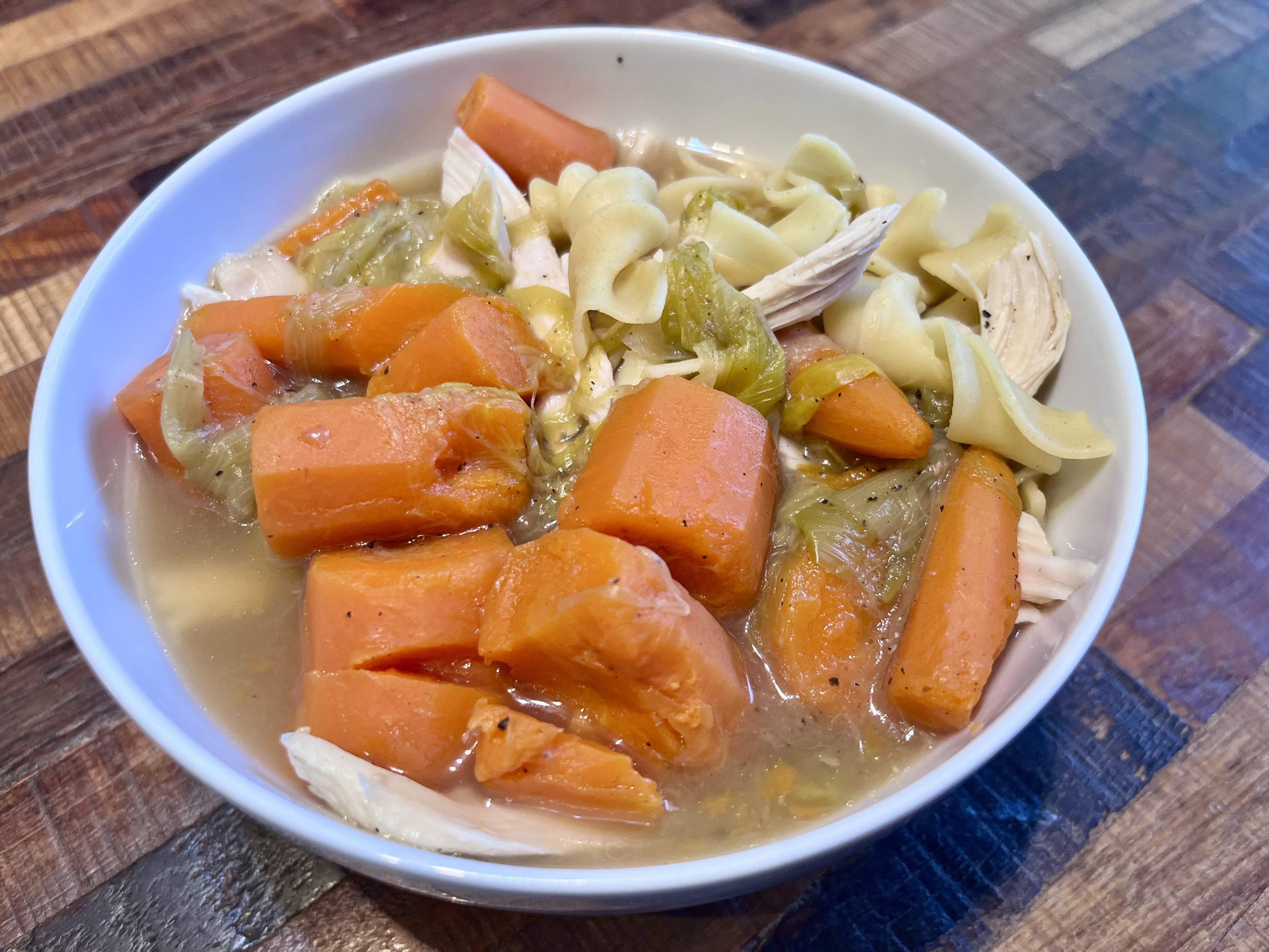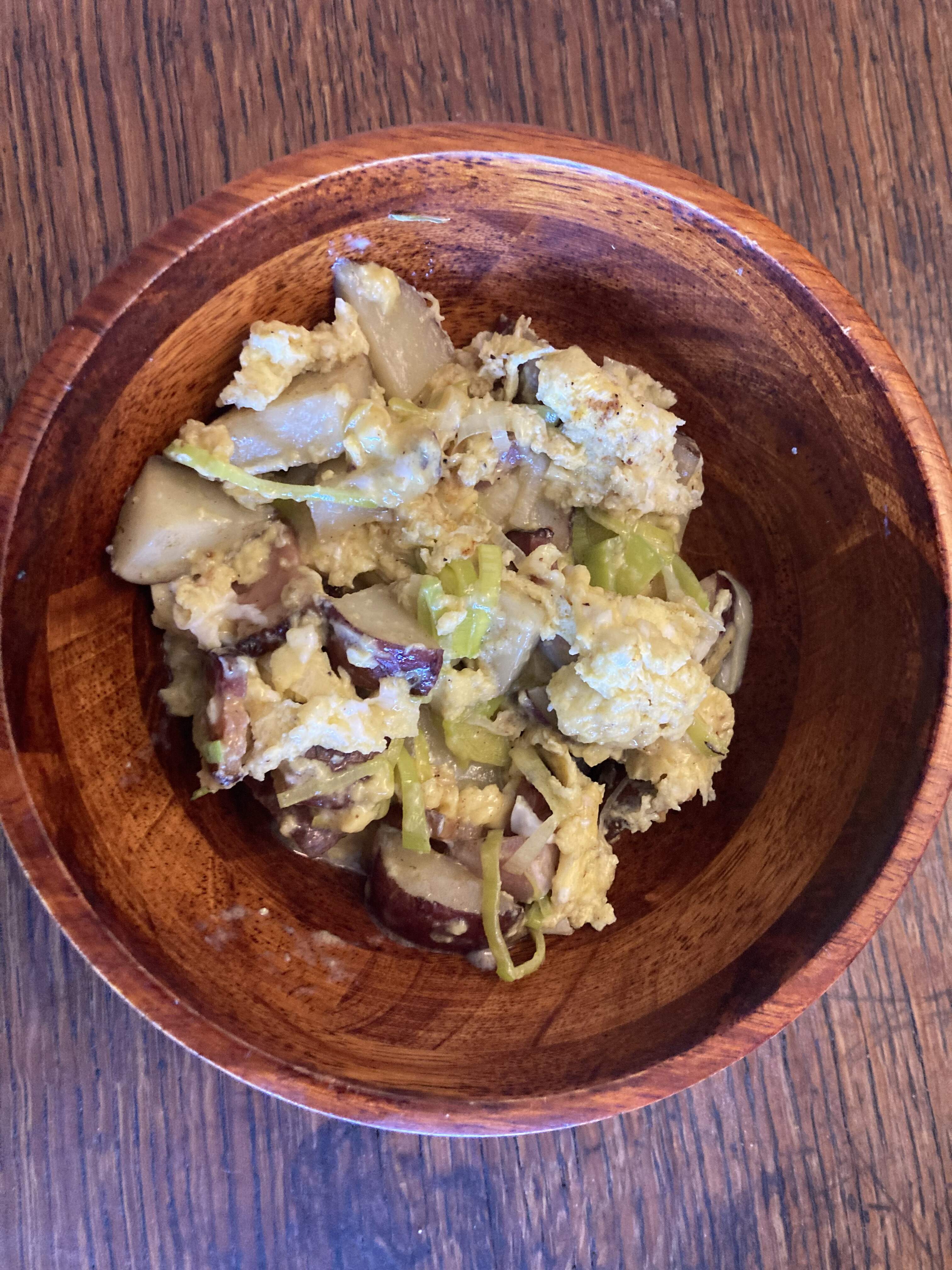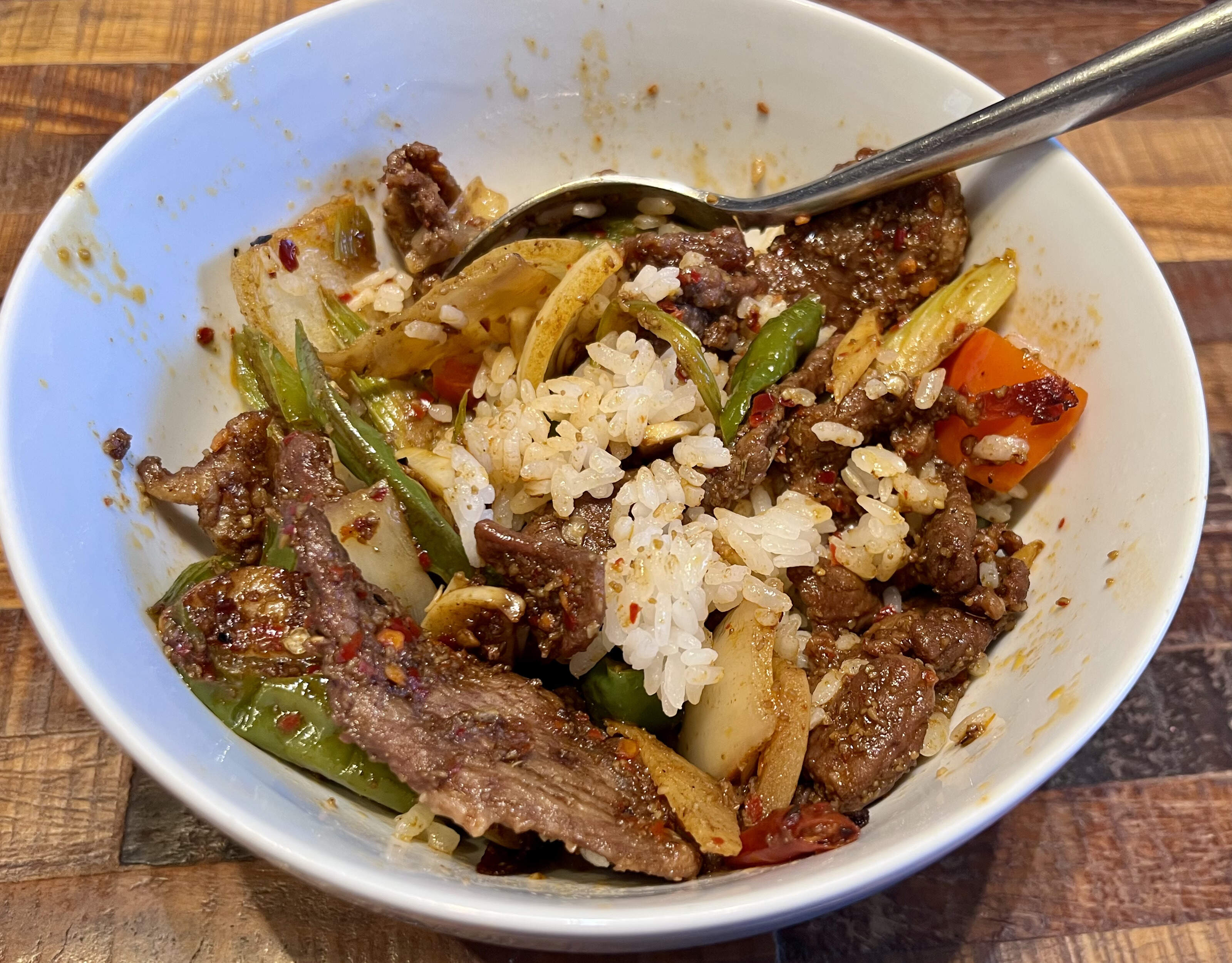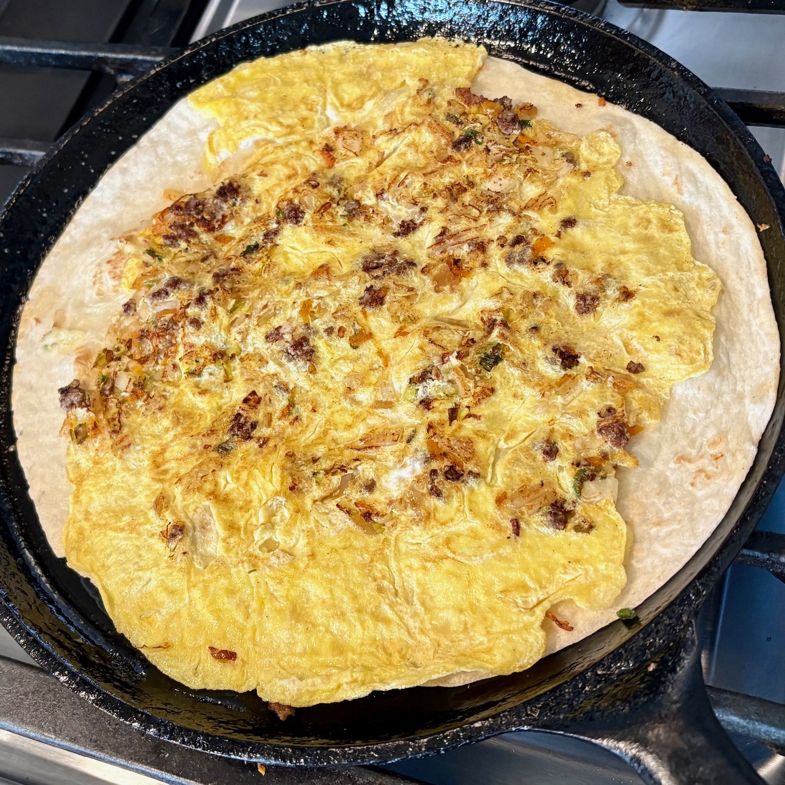 In the Stupid-Easy department: NYT’s faux Jian Bing (gift link). Flour tortilla. Leftover chow mein (minced). An egg scrambled with a splash each of light soy and sesame oil. Served with homemade chili crisp. Ate one, wanted two. ![]()