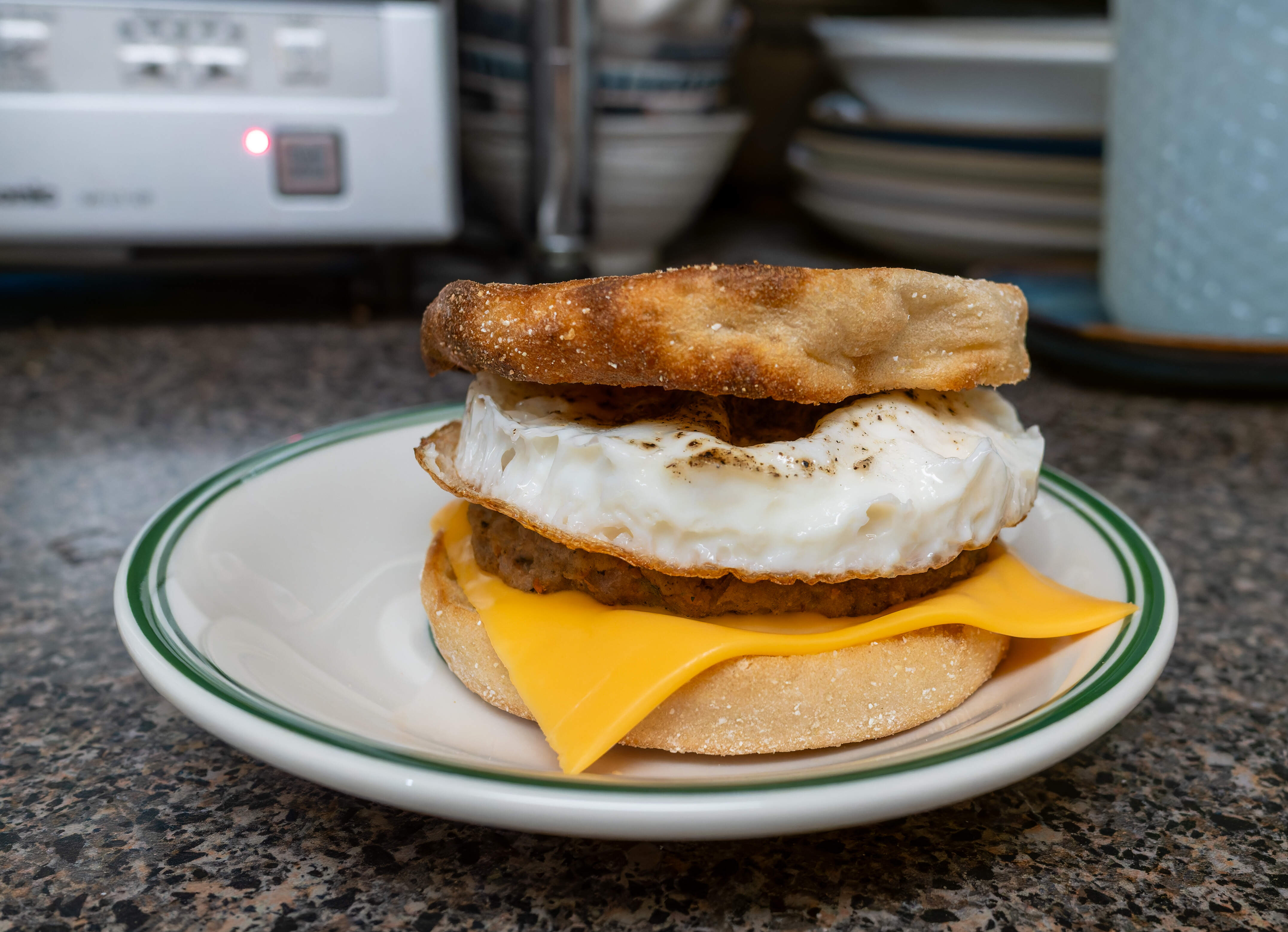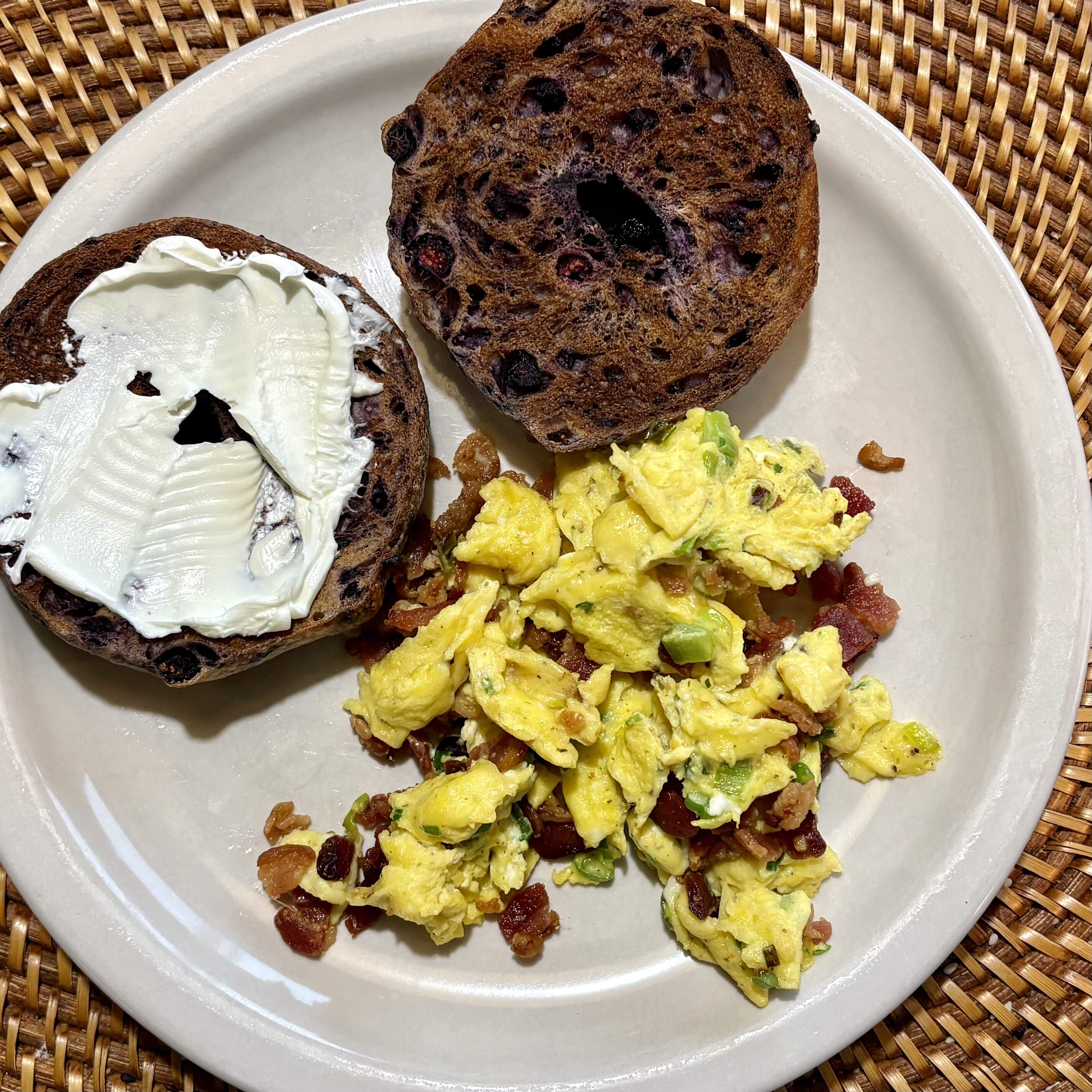 Sandwiches on homemade egg bagels with scallion-scrambled eggs, bacon, provalone, and Kraft singles. A few garden strawbs (from frozen).