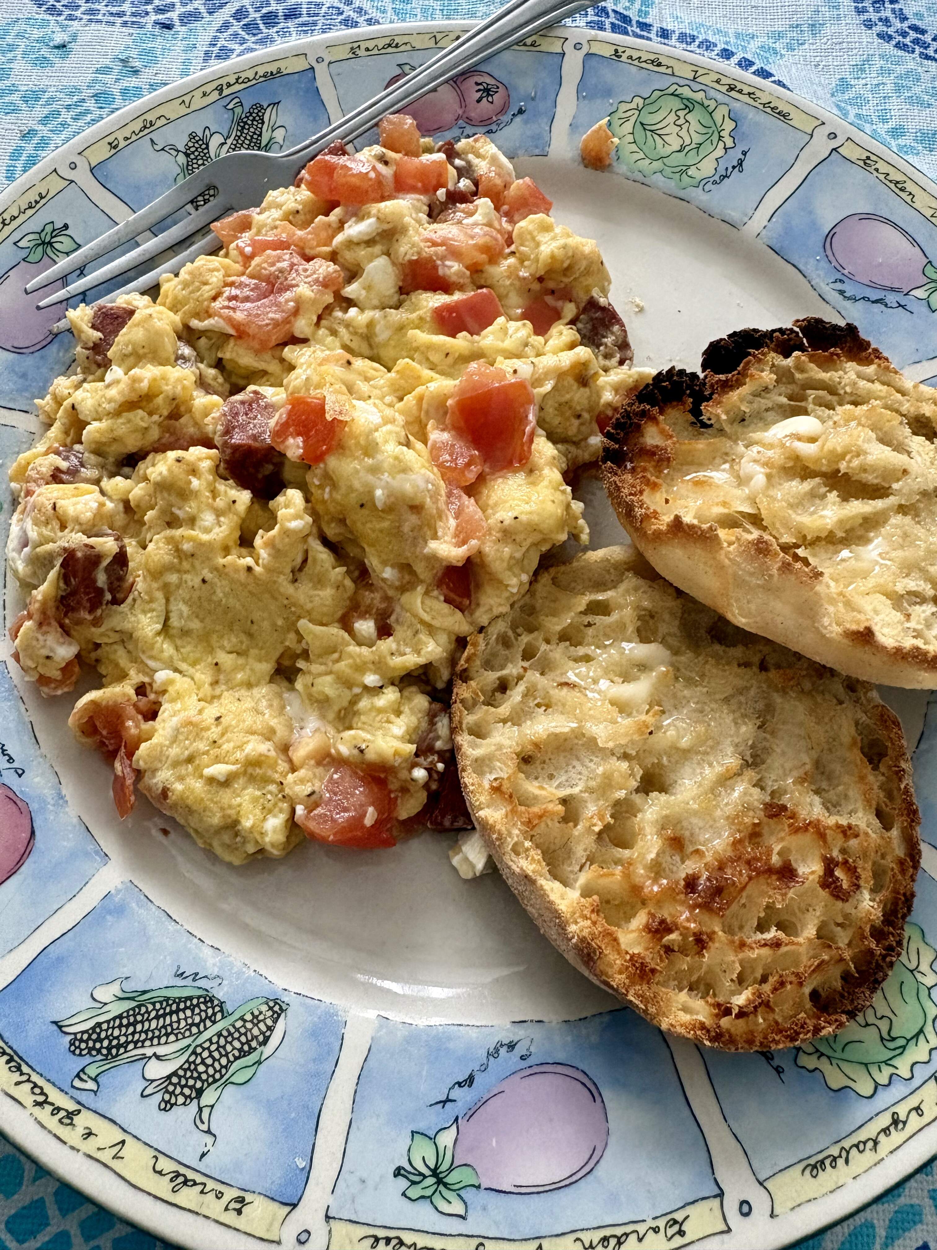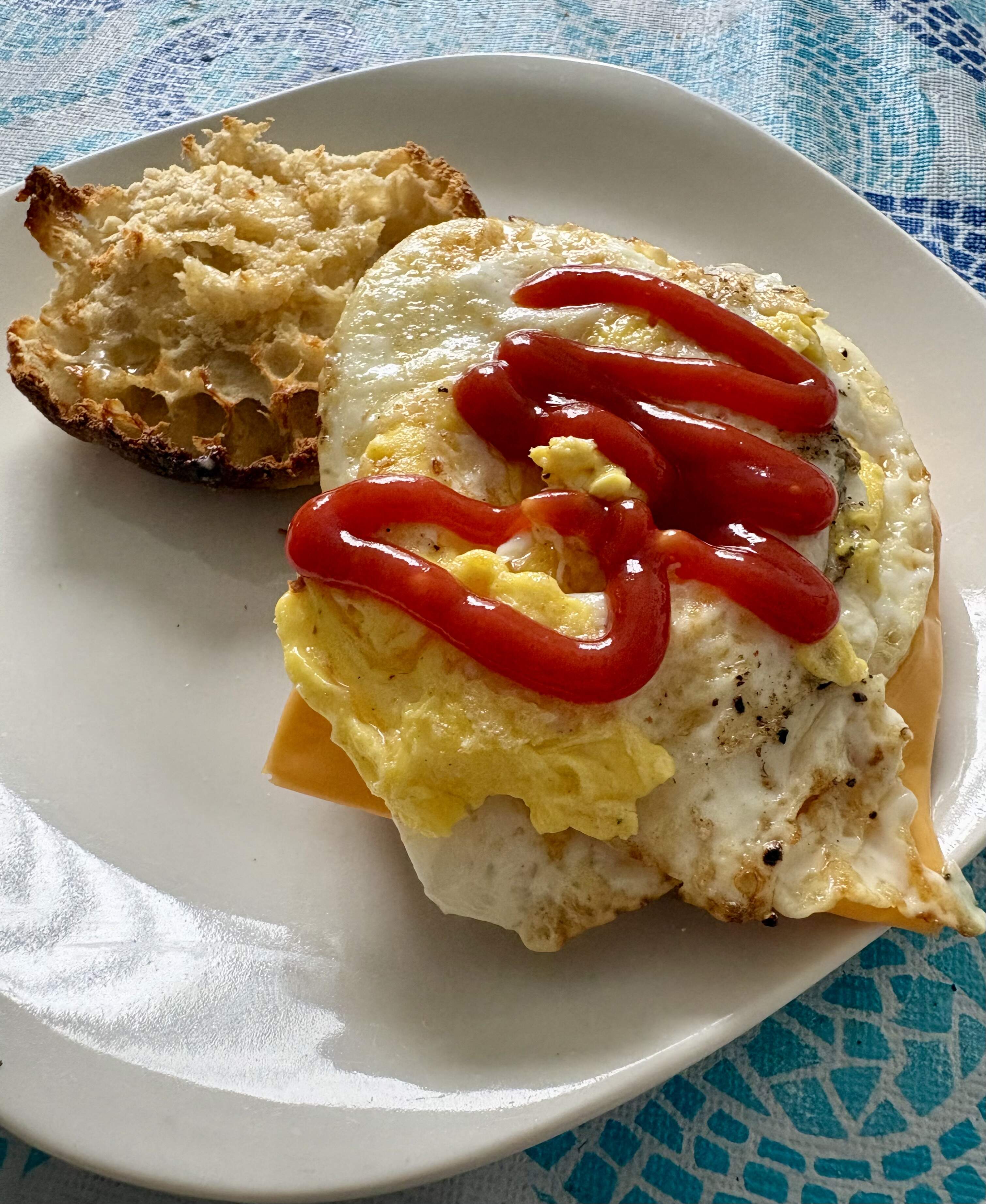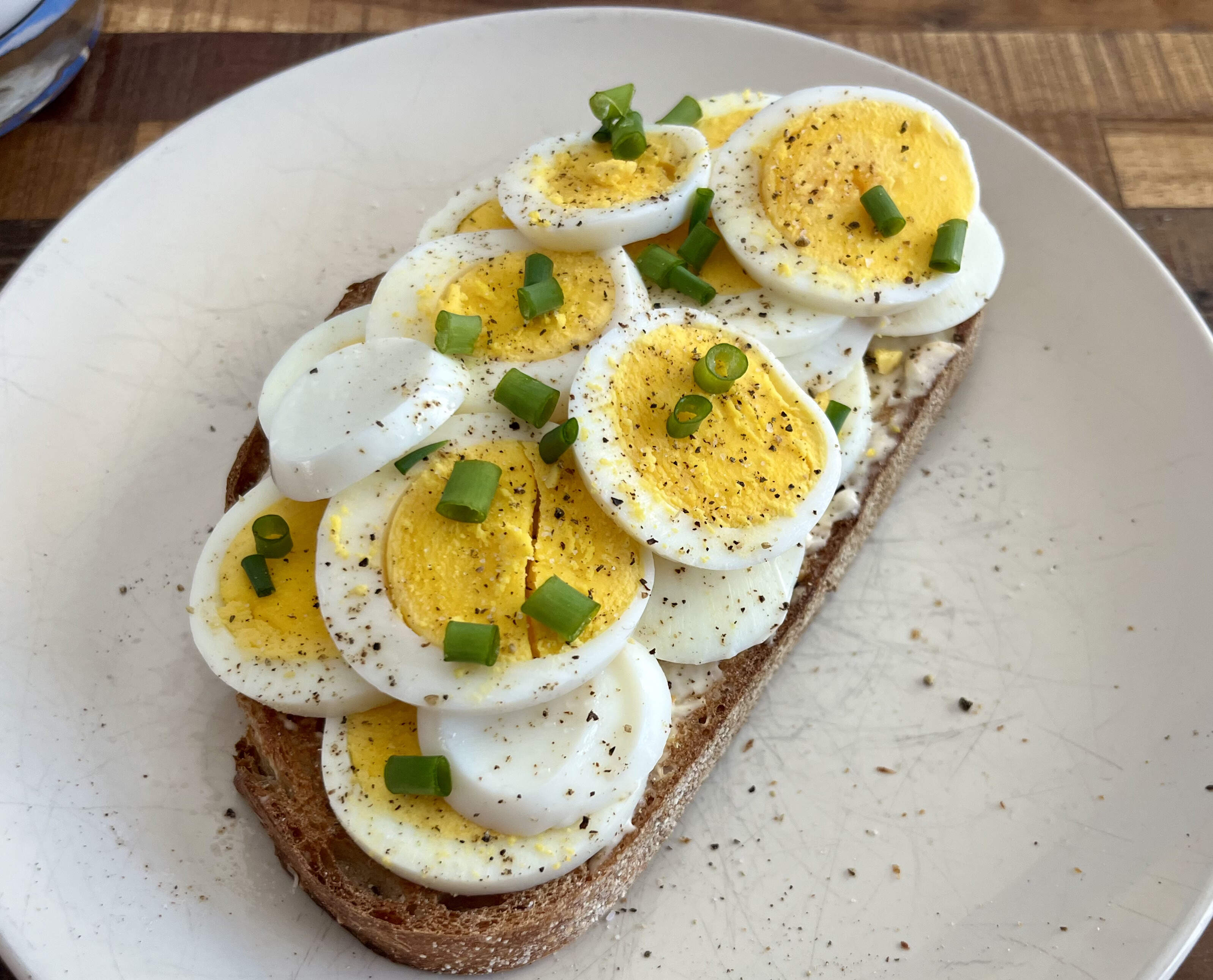 Slice of Aldi’s bistro bread, local garlic & herb cream cheese, 2 HBEs from local hens, paddy o’scallions — the only Irish remnants ![]()