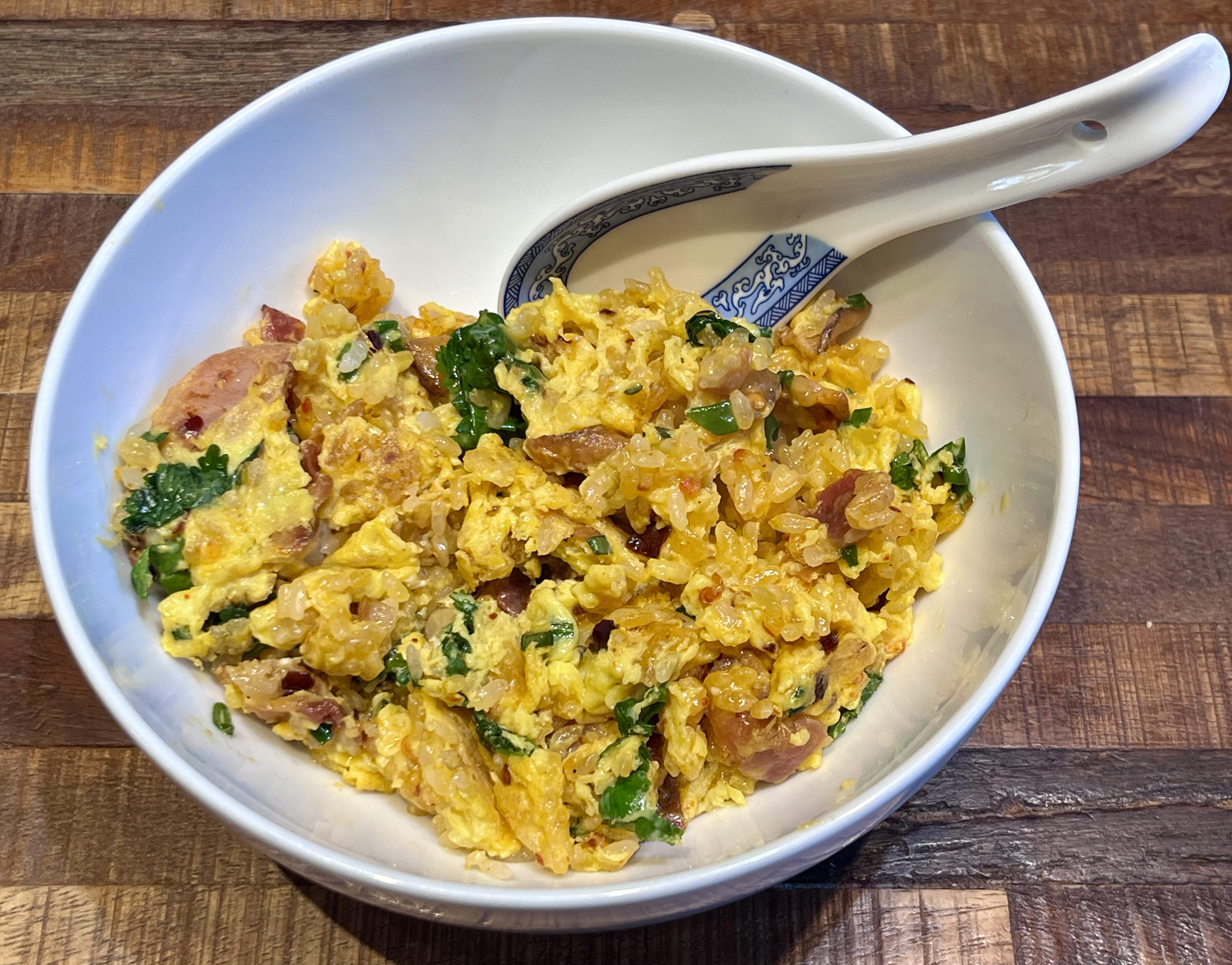 Returning from a stand up workshop positively starvated I made bacon-fried rice inspired by @ricepad — alas not with the Lancaster 5-spice bacon, as we still had ye olde bacon to finish up first.