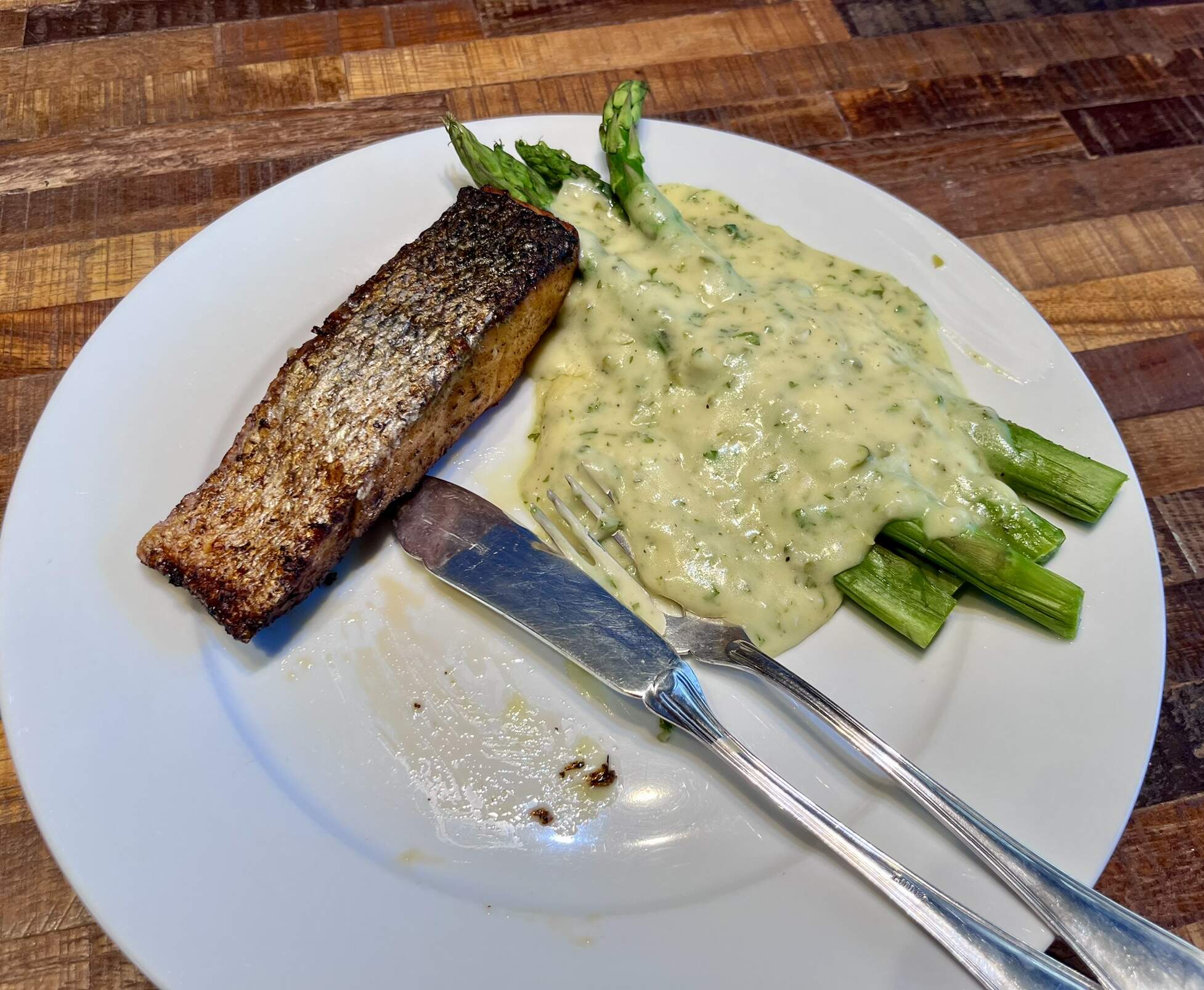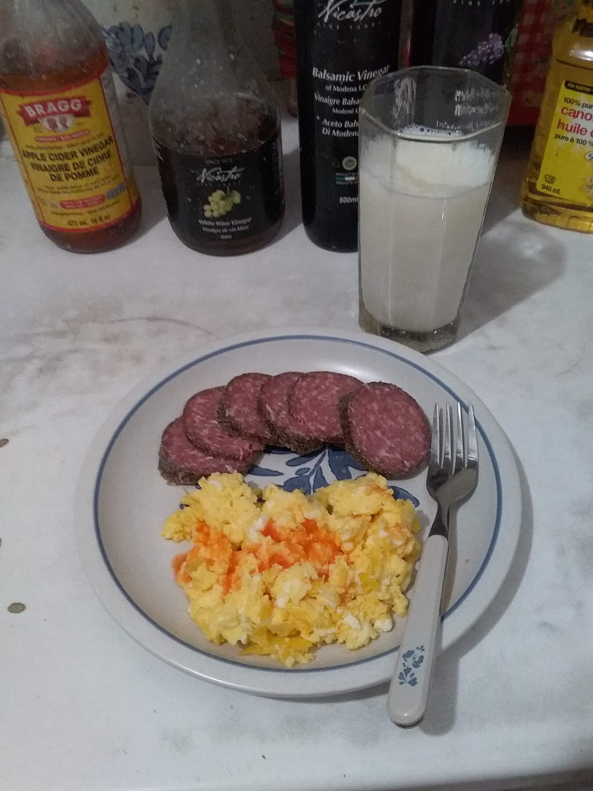 The dinner I never had last night is my brekkie today: the salmon filet heated & crisped up bee-yoo-tifully in the AF, and I may have gone a bit overboard with the hallapeeno holla-n-daze, but it’s fuckin’ delish