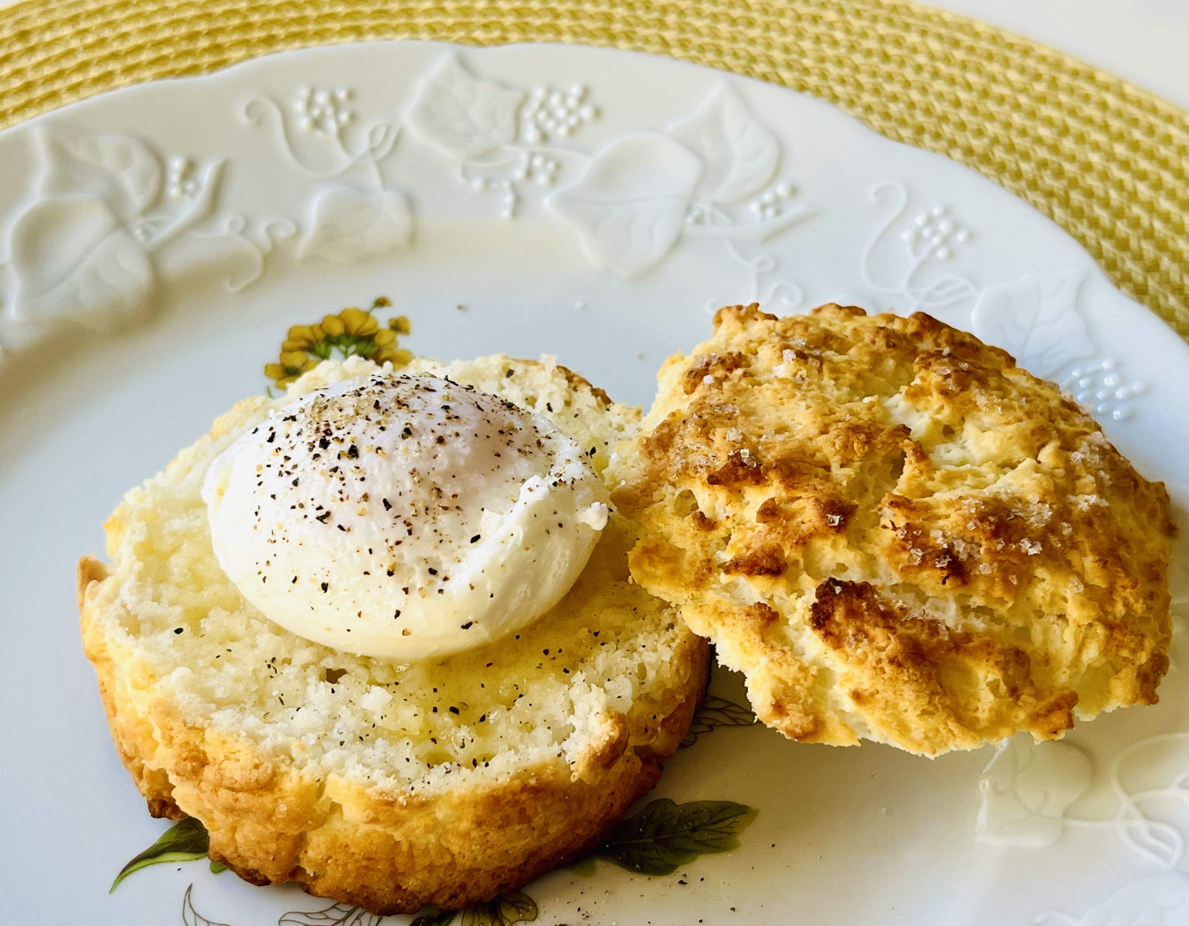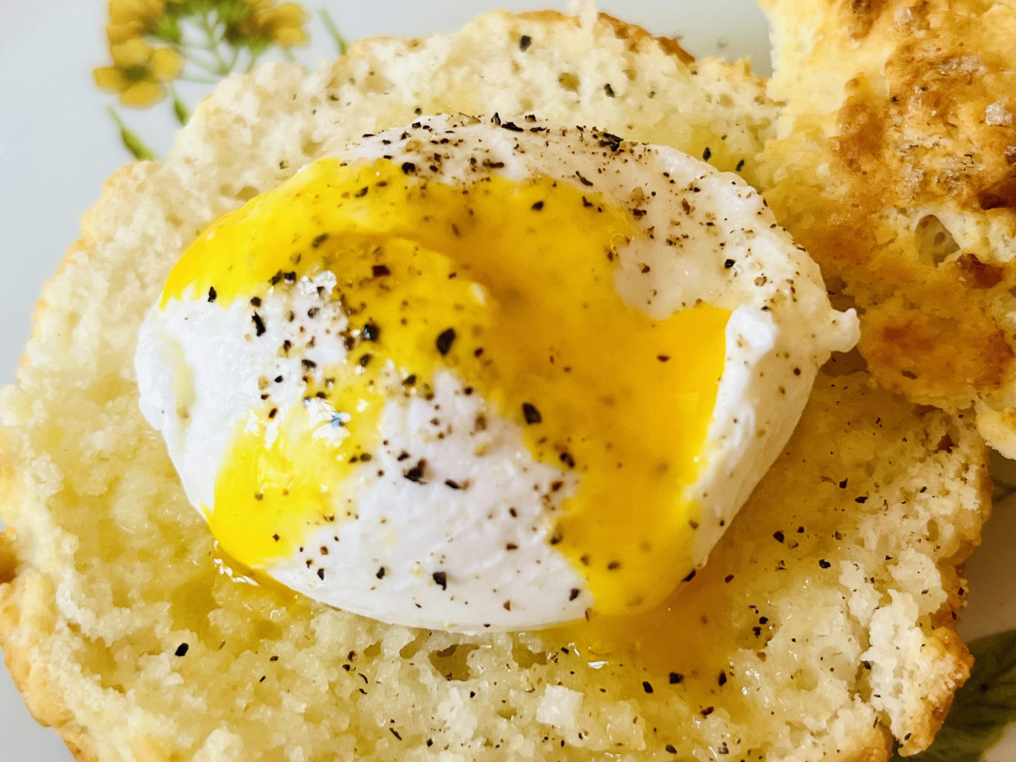 Micro poached egg on a biscuit , biscuit was brushed with melted butter and Fleur de Sel prior to baking.