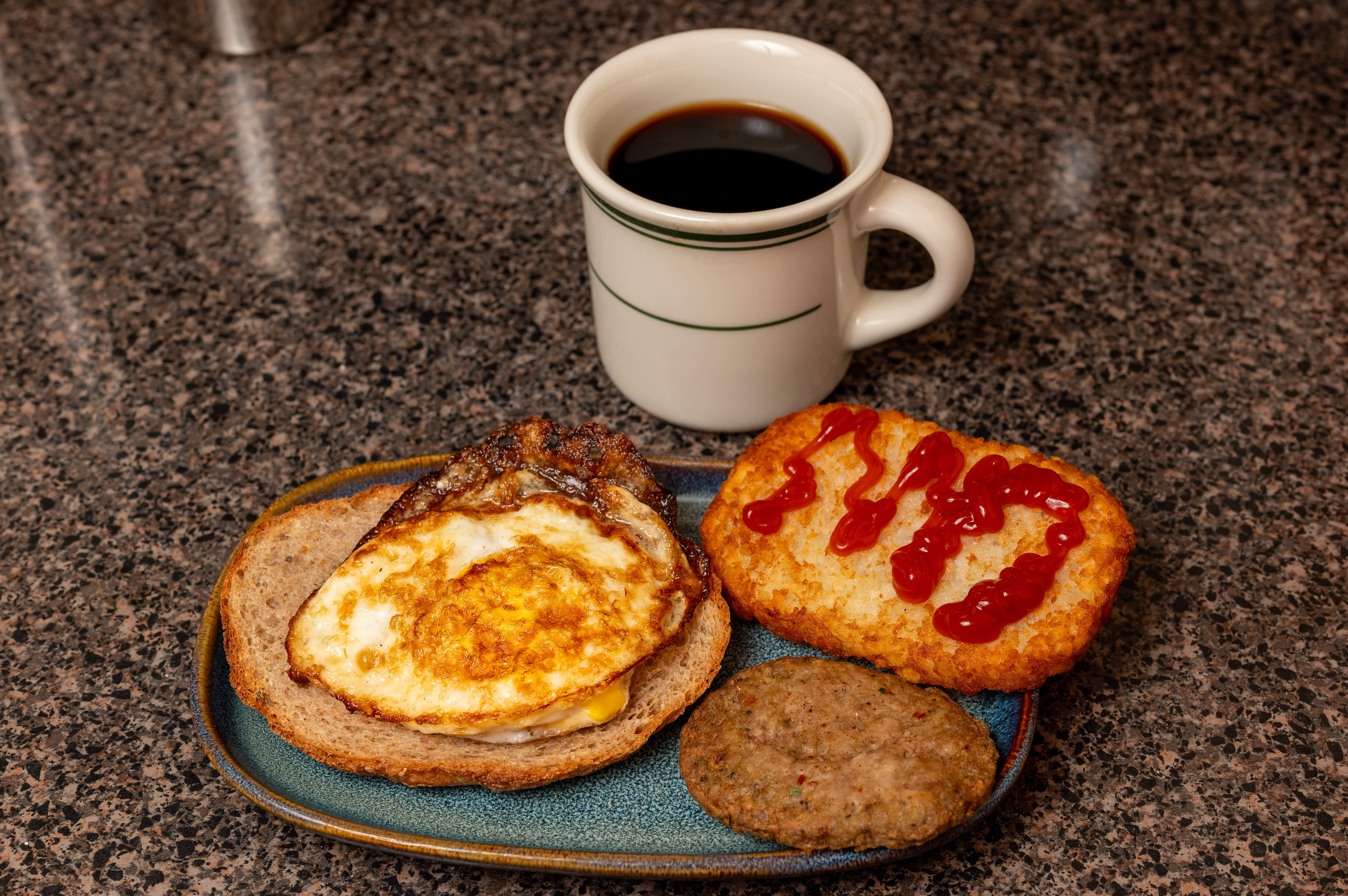 Egg over hard on bread heel toast with Trader Joe’s hash brown and chicken sausage patty with coffee.
