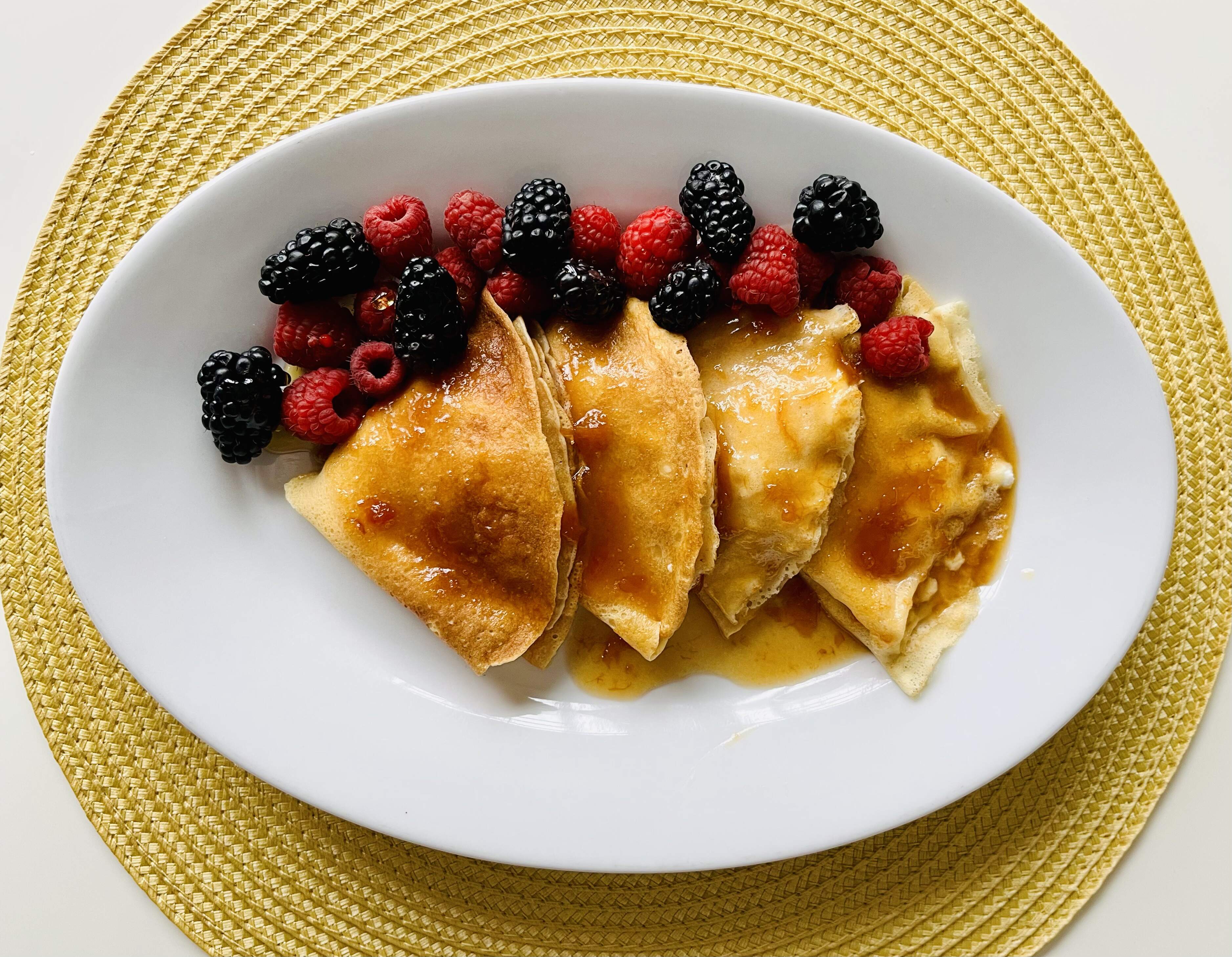 I was happy to have four crepes from yesterday in the fridge, so filled them again with ricotta and the apricot jam/butter mixture. Berries were the fruit of choice this morning, drizzled with the very last of the jam mixture.