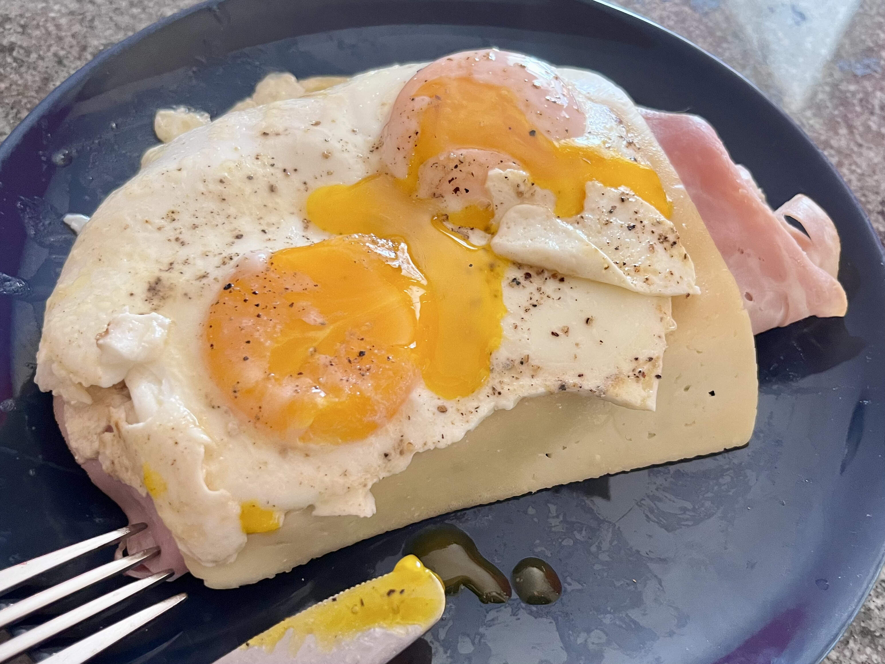 Toasted slice of Aldi’s bistro bread, shallot & chives Boursin, Wegmans’ celebration ham, havarti, 2 local eggs from a buddy’s hens.