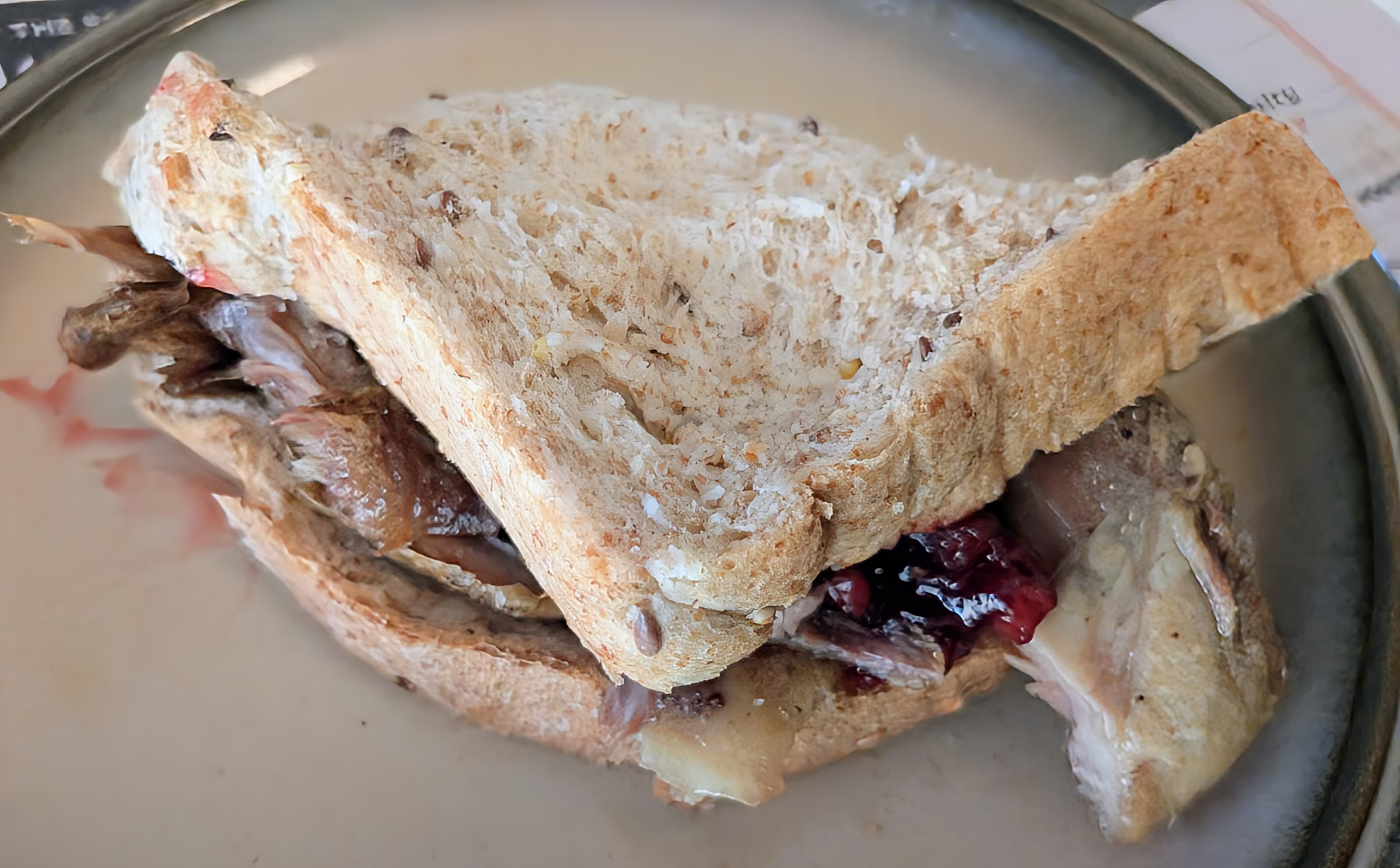 Leftover from David’s Bistro duck confit and Darbo lingonberry sauce on La Noisette whole wheat bread