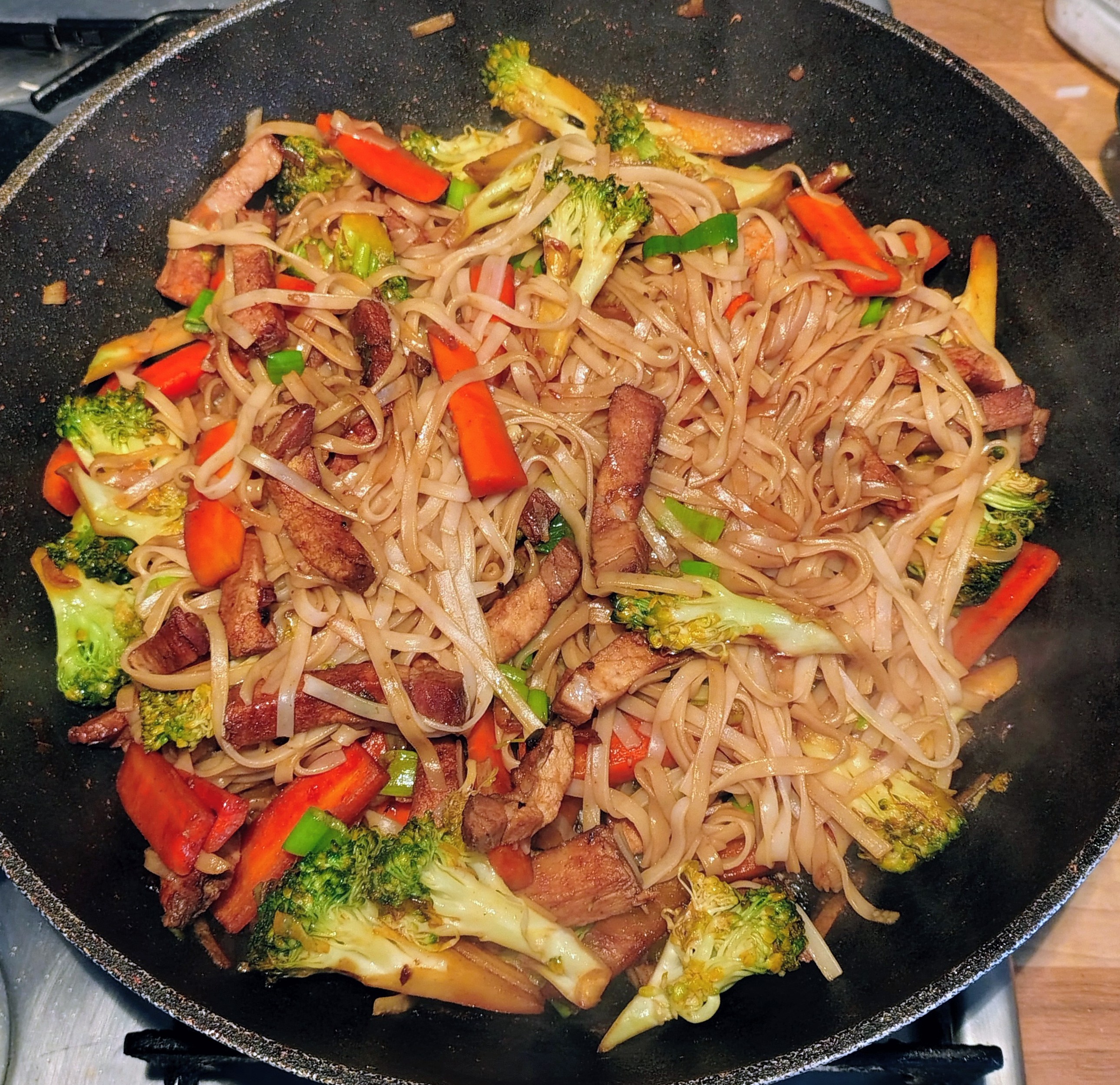 Fridge clear-out stir-fry: broccoli, carrots, spring onions, green chilli, leftover char siu, fresh rice noodles, stir fried in the rendered pork fat and juices from the char siu.