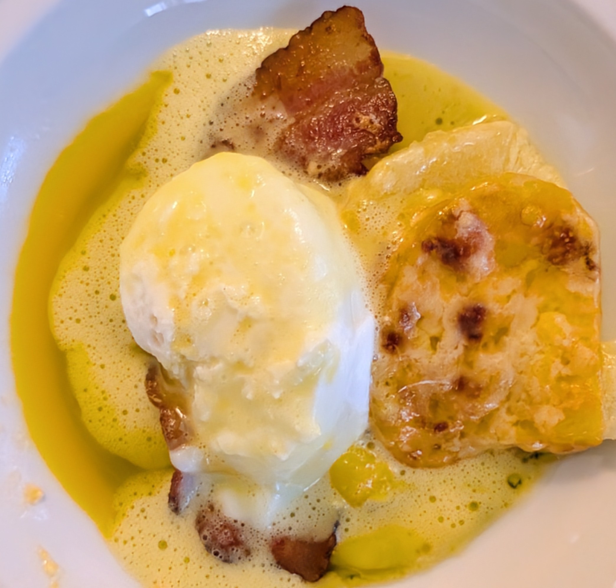 inspired by Benny’s Bistro in Ottawa, poached egg with hollandaise, streaky bacon and scalloped potato