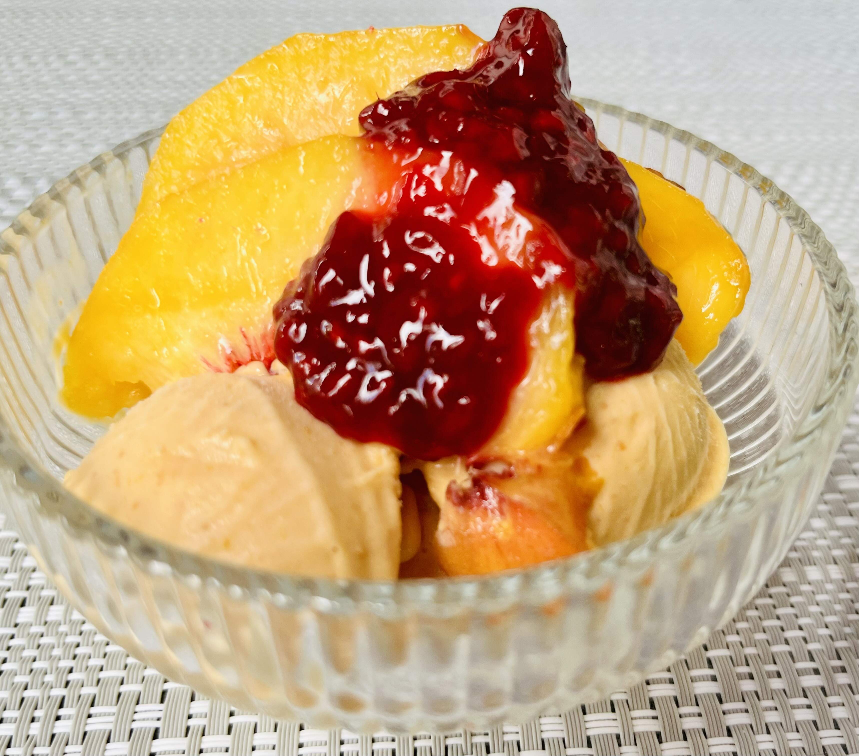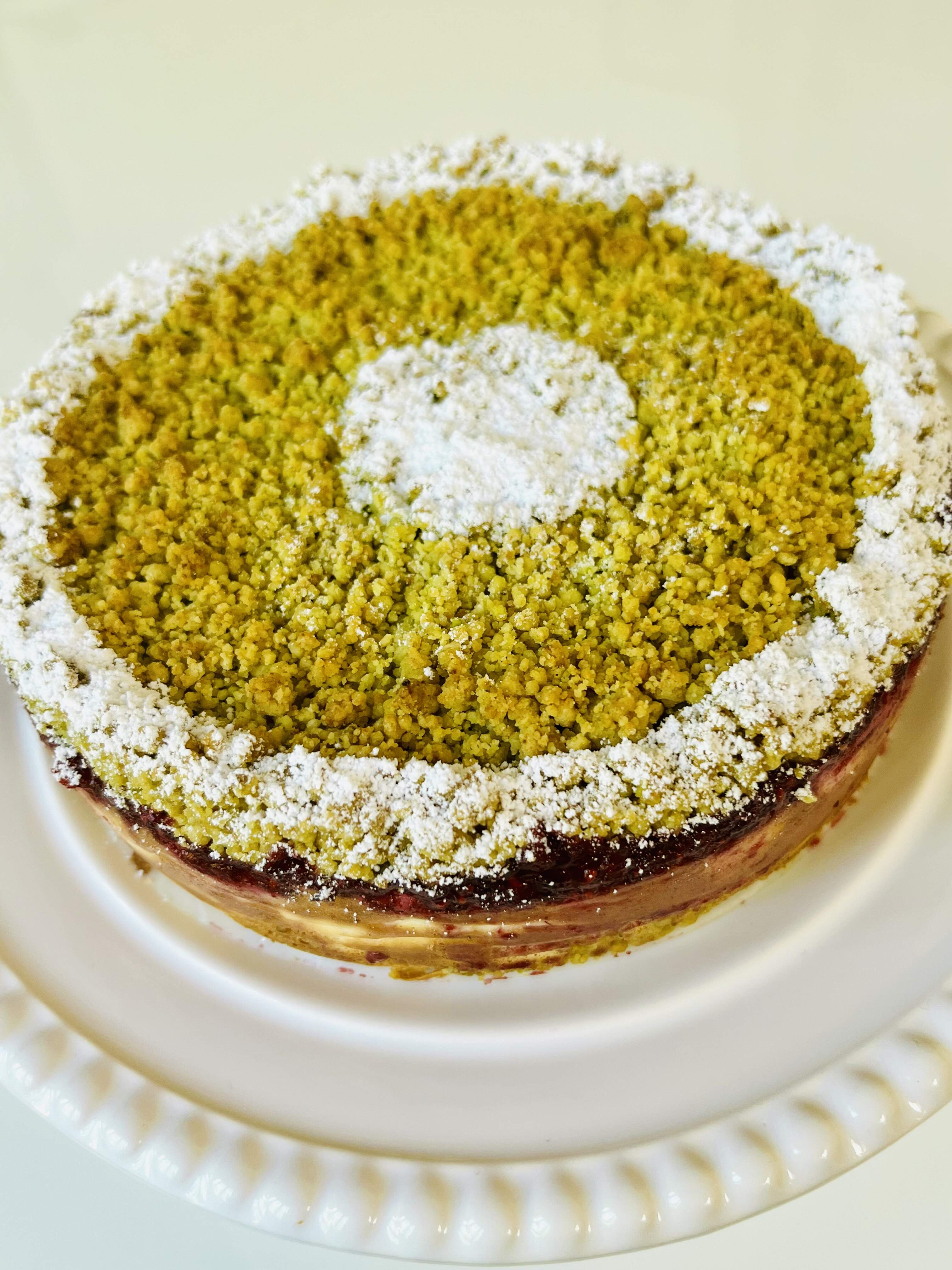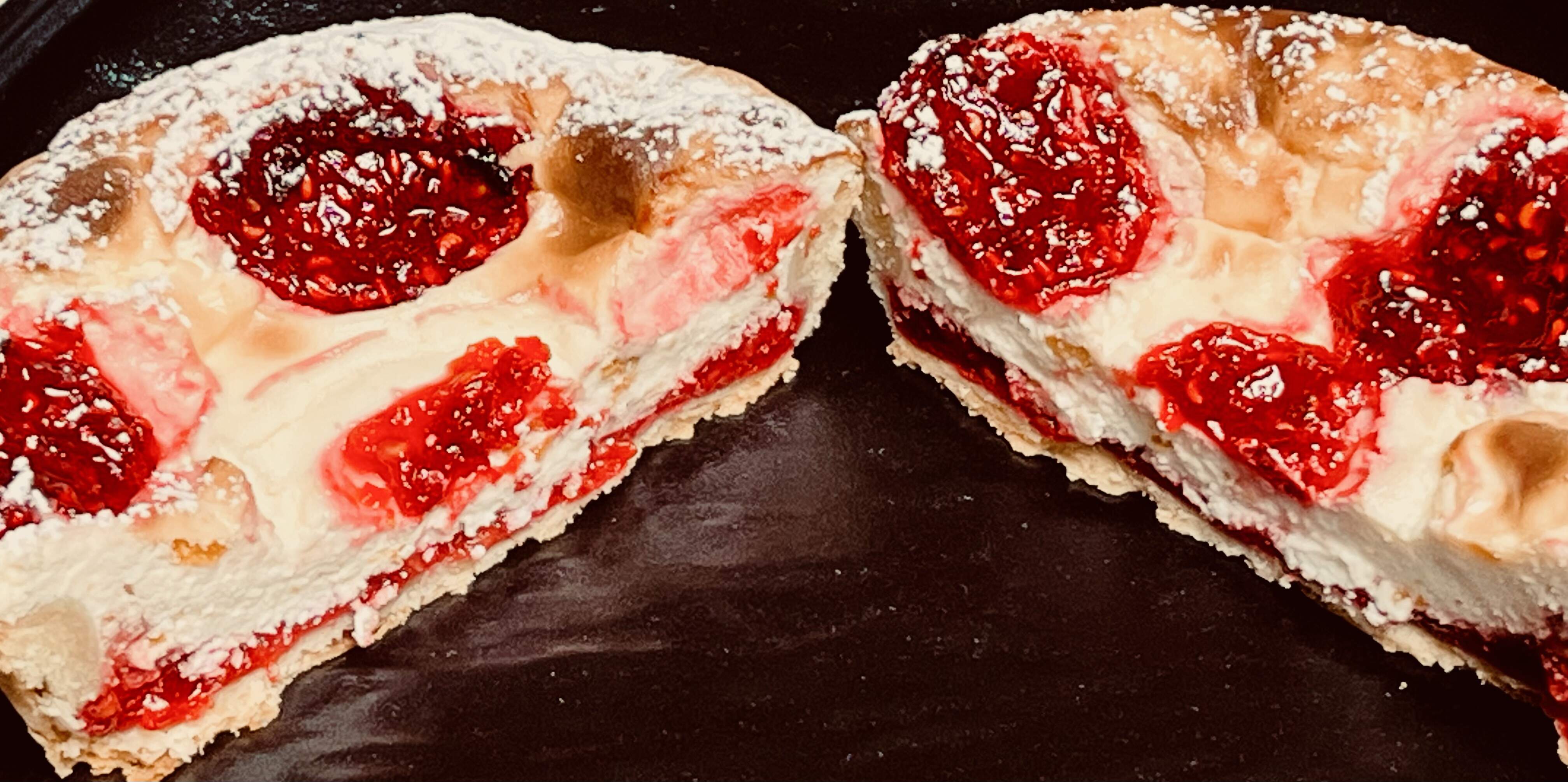 A small 4” tart with whipped ricotta filling and flecks of candied orange peel, A layer of raspberry compote is on the bottom and dollops of the compote on top.