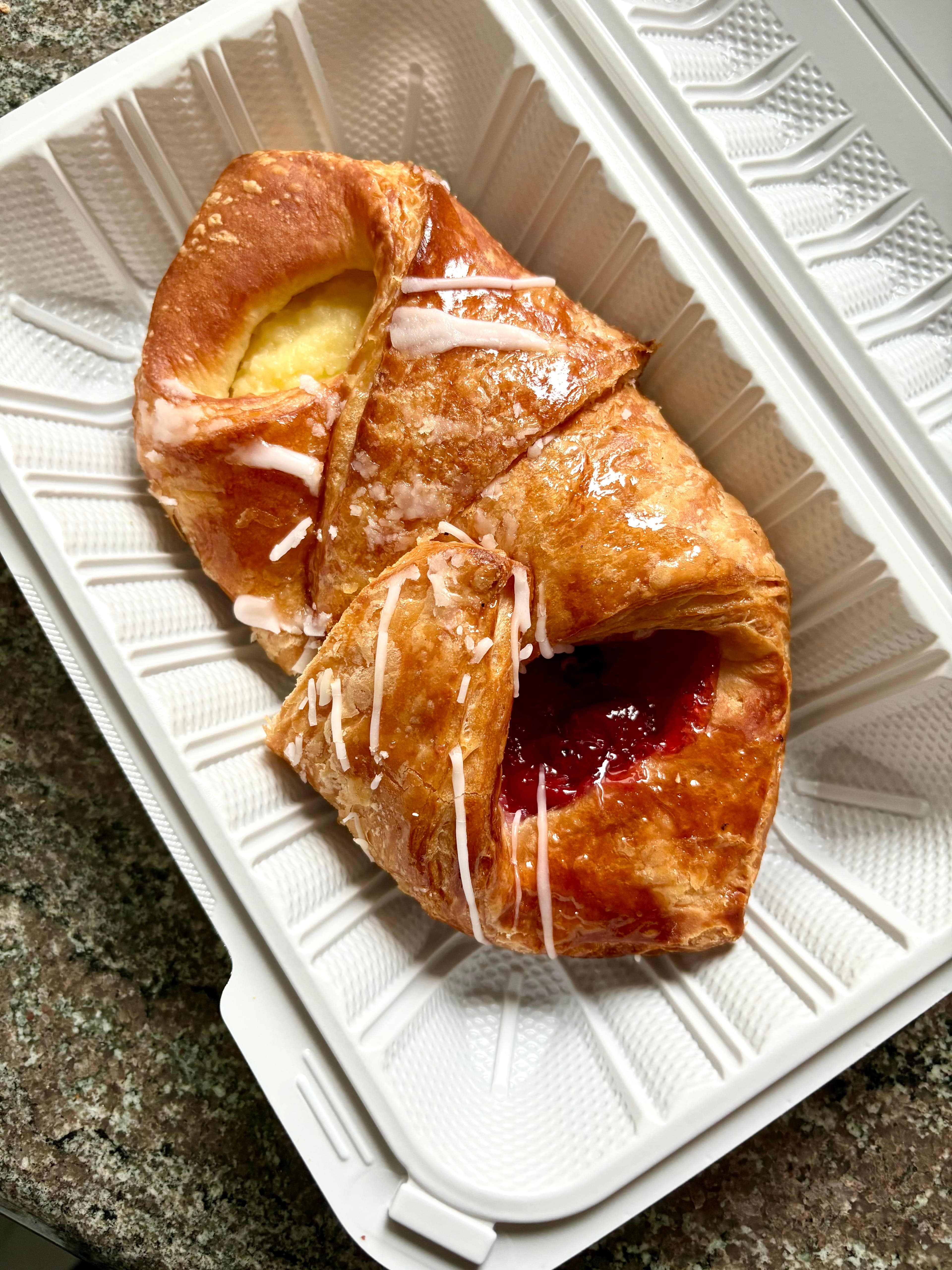 Half a cheese danish and half a cherry danish, from a fantastic bakery in the burbs, courtesy of one sister.