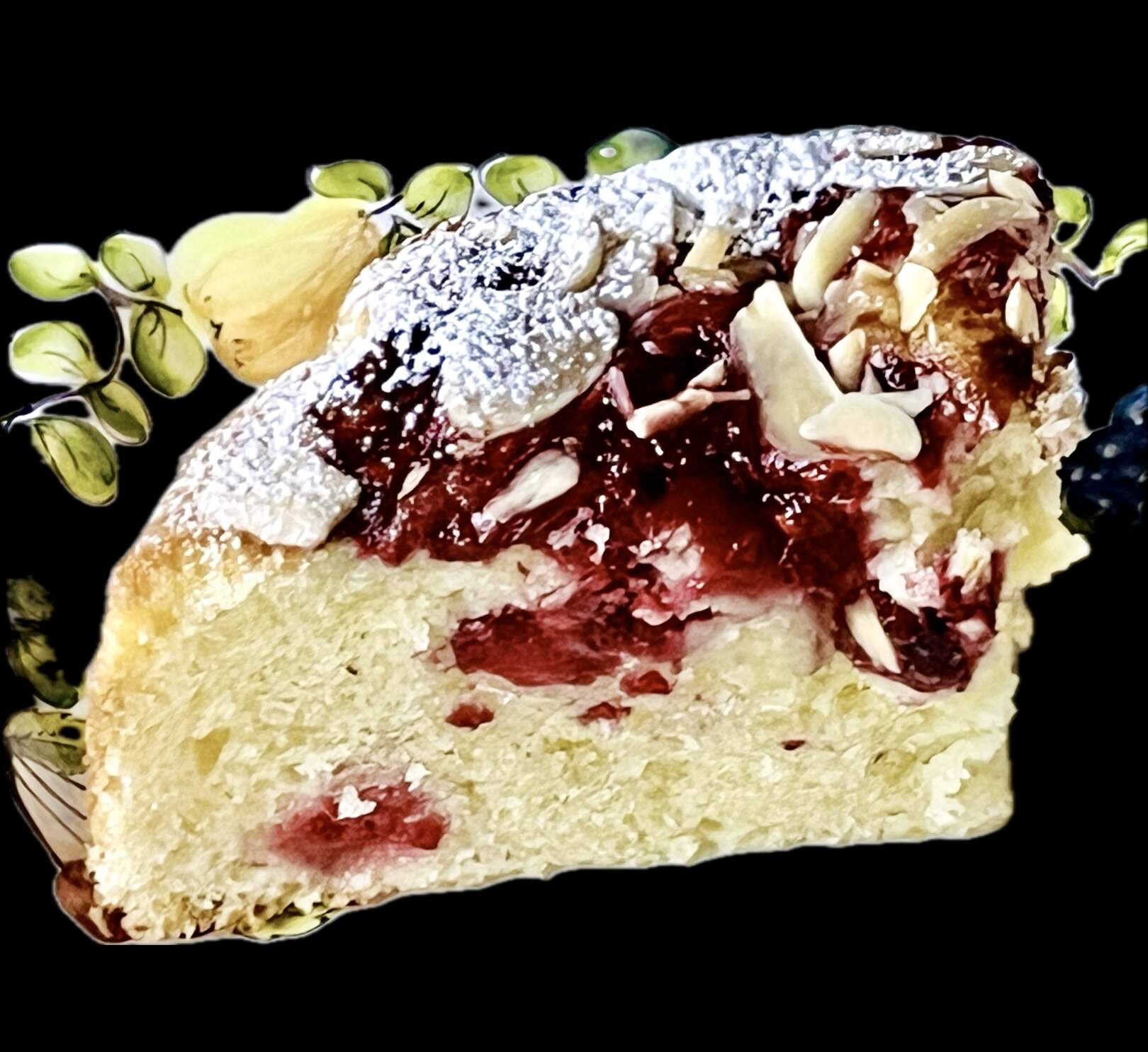 Raspberry jam/fresh raspberries/ flaked almonds …a tender cake with almond flour for additional moistness, a simple but delicious cake that would lend itself to other berries. Blackberries or blueberries would make for deliciousness.