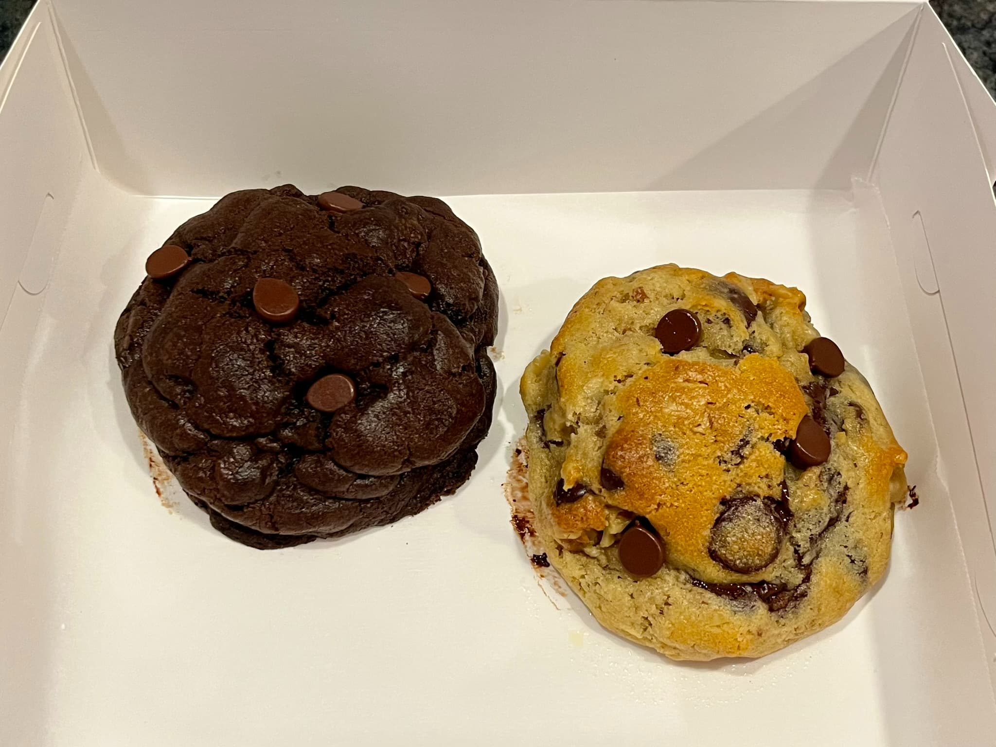 A chocolate chocolate chip cookie and a CC walnut cookie. He loves the double chocolate cookie, whereas I prefer the other one.