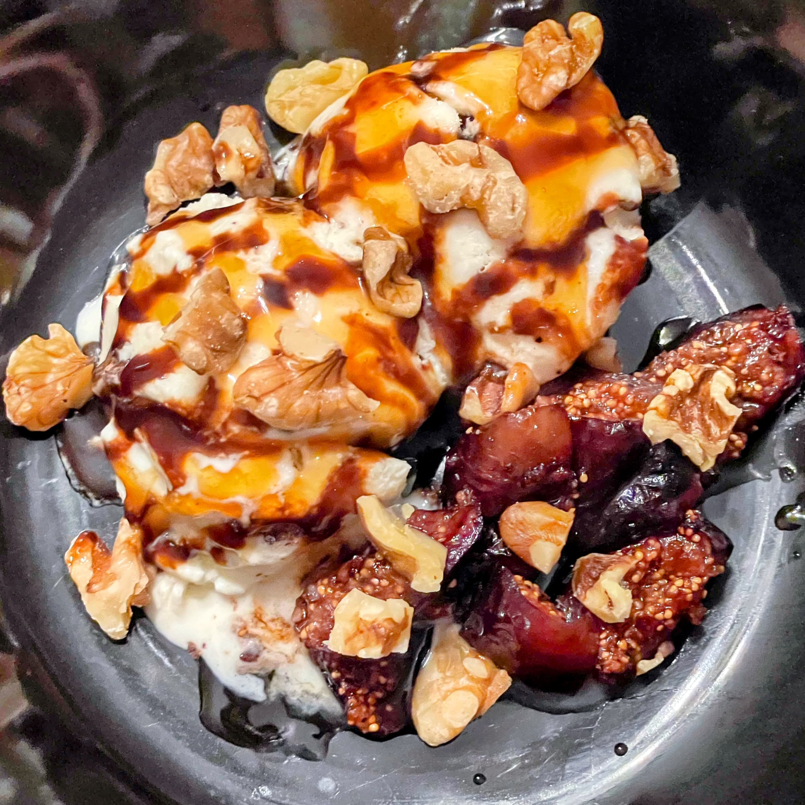 Mrs. P made Ben and Jerry’s cannoli ice cream with fresh roasted figs, hot honey, chopped walnuts, and reduced balsamic