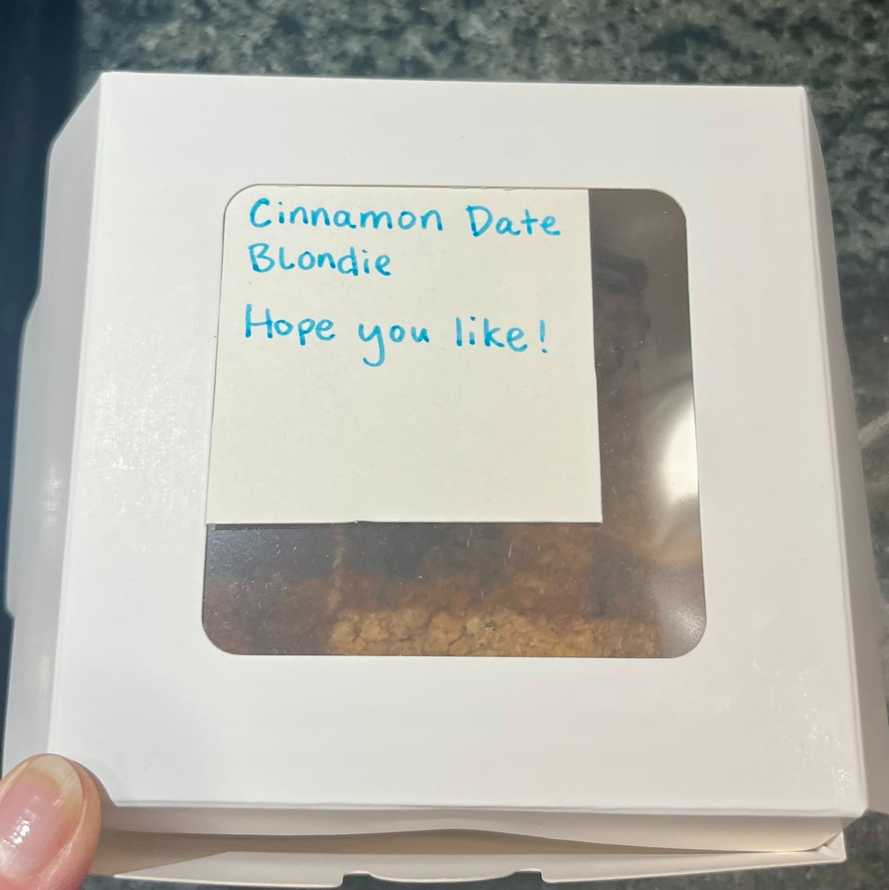 Our cookie lady gifted us an ‘experimental’ cinnamon date blondie along with yesterday’s order