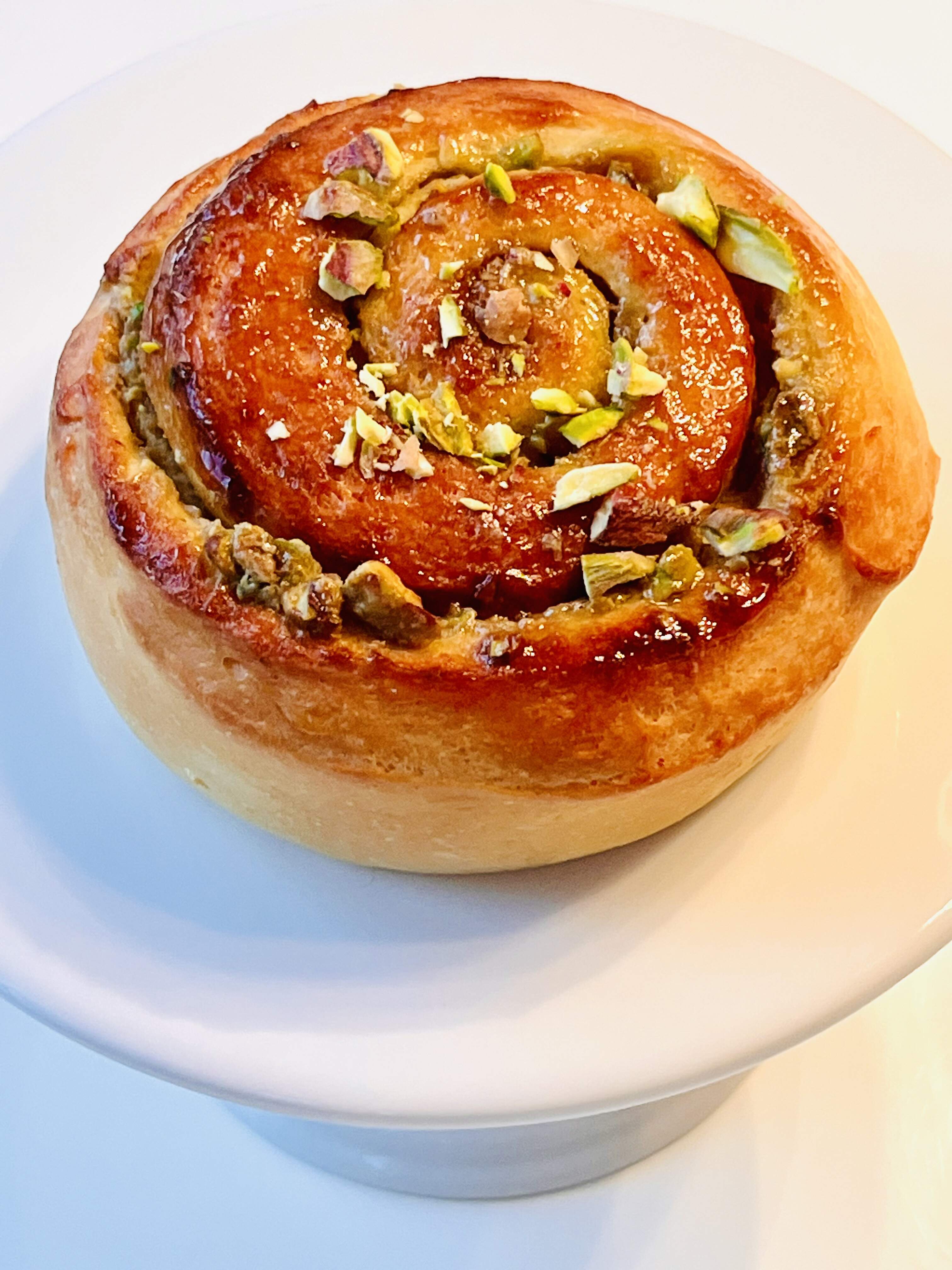 Pistachio roll filled with pistachio crème (65%) and chopped pistachios. Brushed with a little bit of honey and chopped pistachios. This was particularly delicious as it was not sweet, from the book,