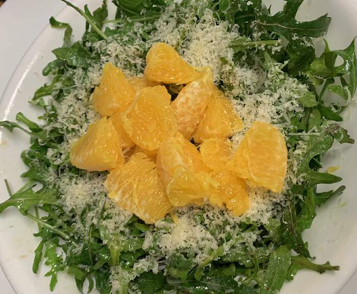A big salad of arugula and orange, followed by spicy tortilla pizza.