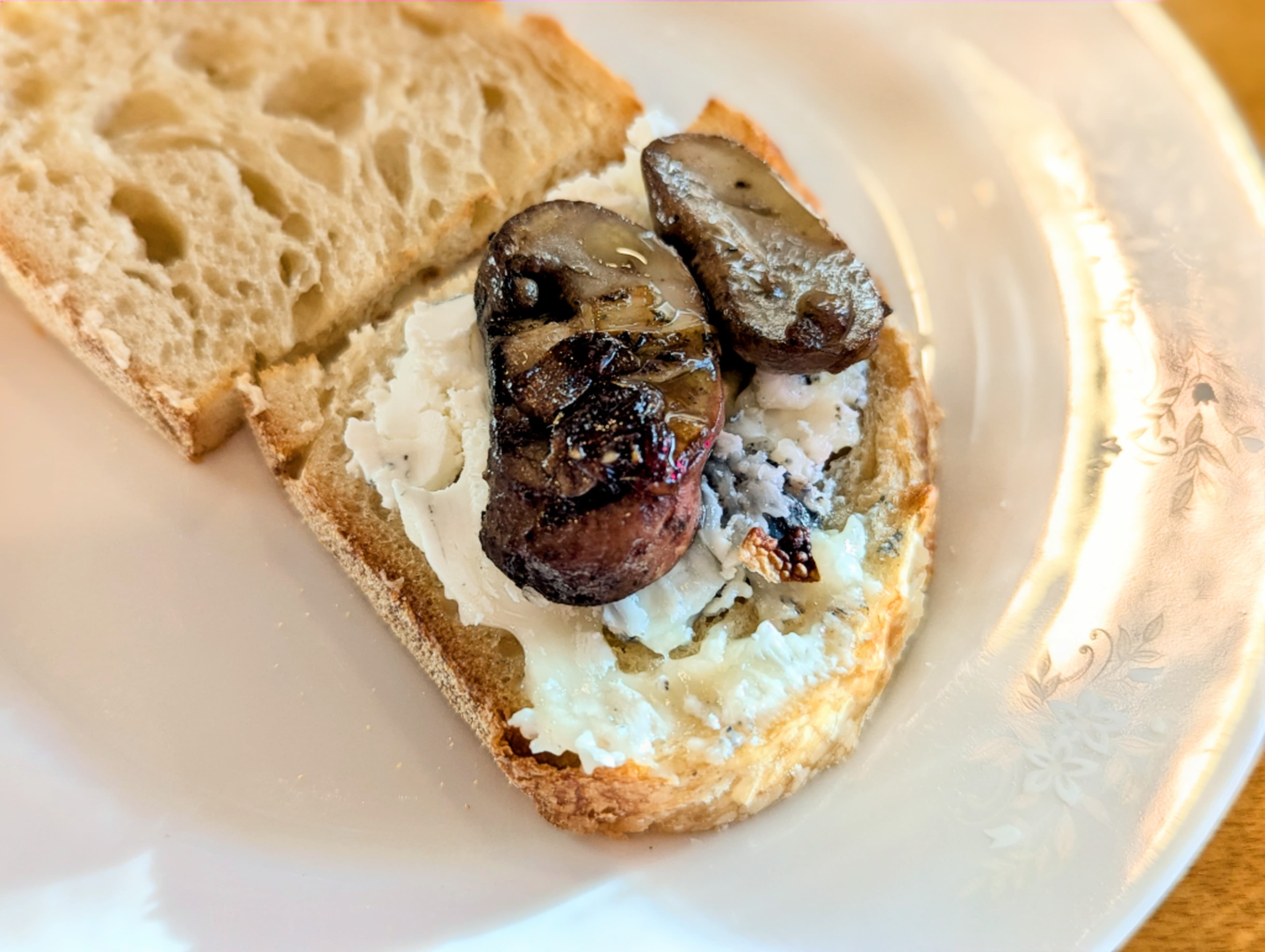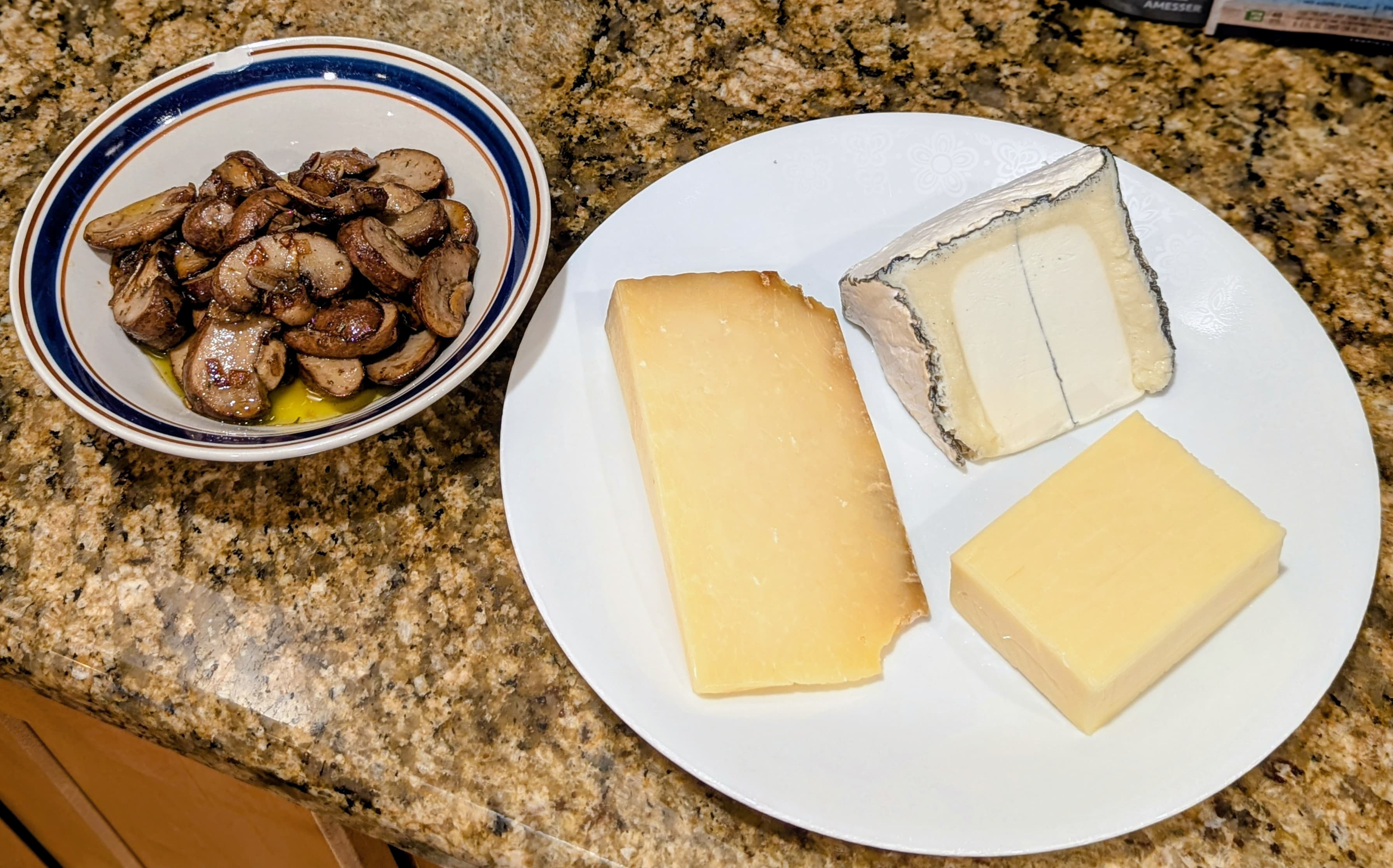 Cheese! Also, sauteed mushrooms and lightly toasted sourdough. Cabot clothbound and regular sharp cheddars, along with Humboldt Fog. Pale ale for him and Pinot Noir for me.