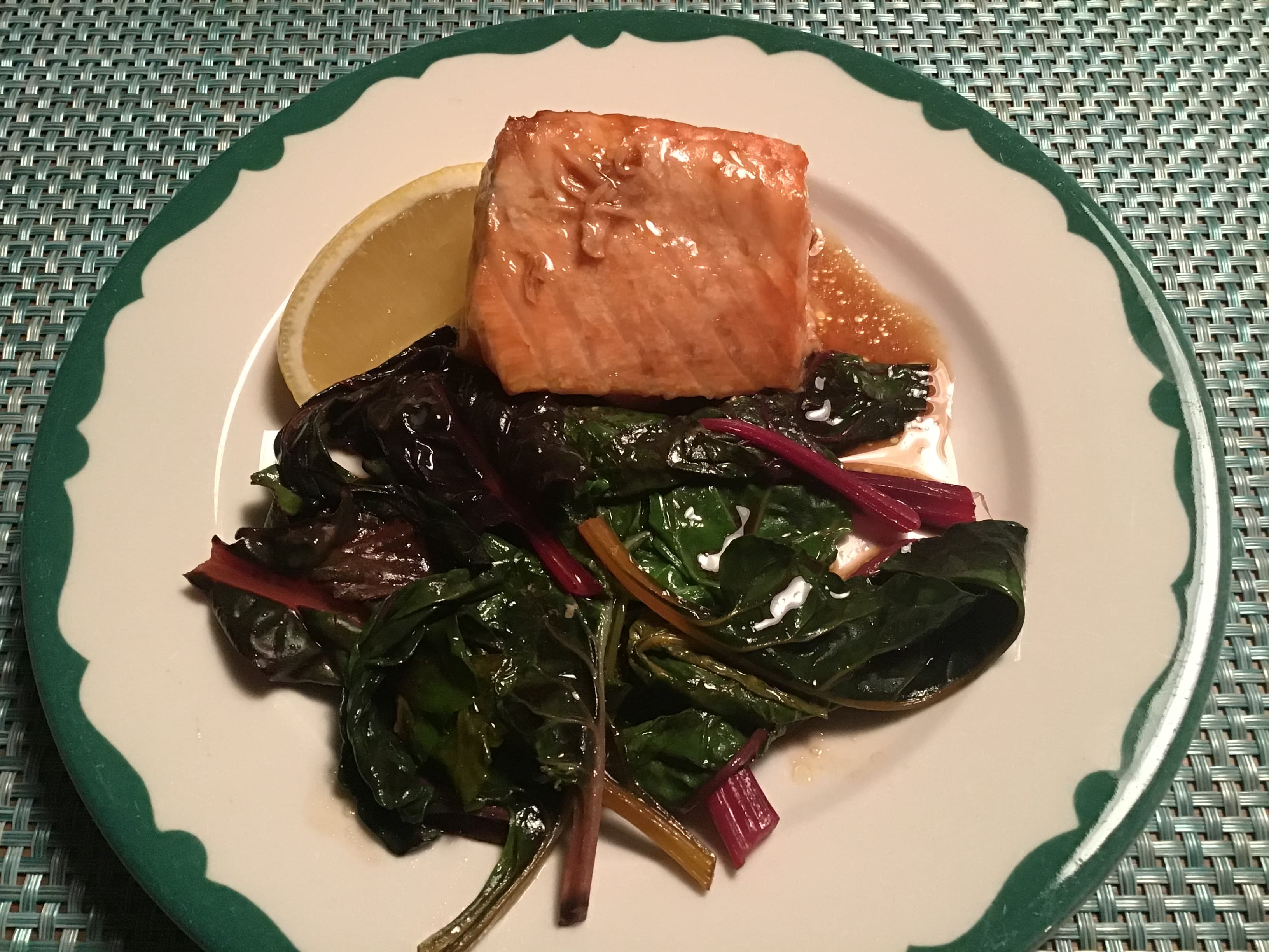 Slow-roasted salmon in soy, butter and lemon juice with FM tween rainbow chard in butter and lemon. Really hit the spot.